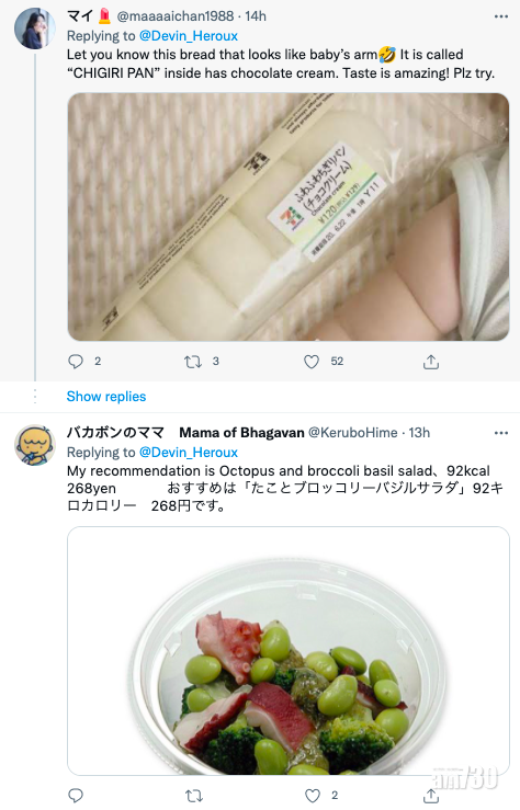 日本網民紛紛留言,有人推介把寶礦力混合雪糕消暑,說很多日本人也這樣吃;另有人推介一款脆皮朱古力雲呢拿雪糕批、一款「睇落似BB手臂」的朱古力醬面包、八爪魚西蘭花羅勒沙律,以及一款有雞肉、蛋、生菜及辣醬的潛艇。