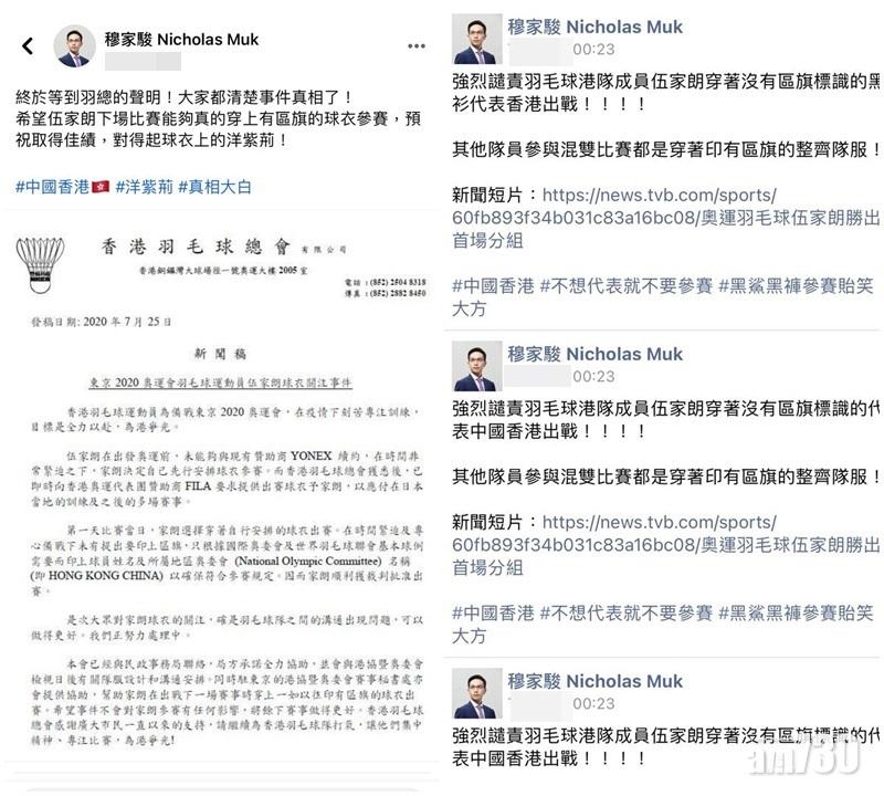 民建聯穆家駿批評港隊羽毛球「一哥」伍家朗穿黑衫黑褲參加奧運,兼且未有印區旗,其後他將「黑衣衫」三字刪去,又在fb轉貼羽總聲明,聲稱「真相大白」。(穆家駿fb截圖)
