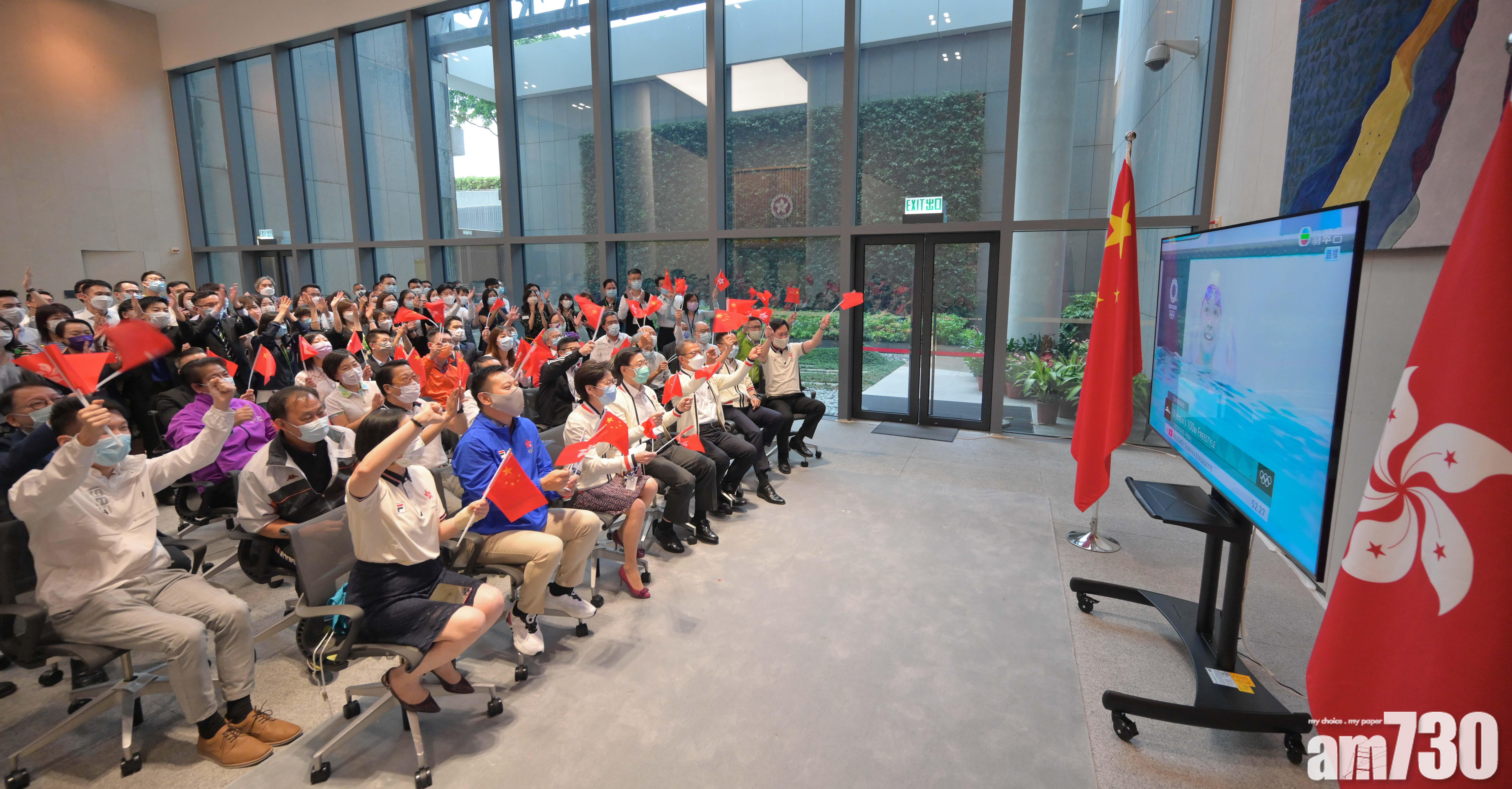 林鄭月娥祝賀何詩蓓再奪奧運銀牌。圖為她與其他官員觀看何詩蓓的泳賽。(政府新聞圖)
