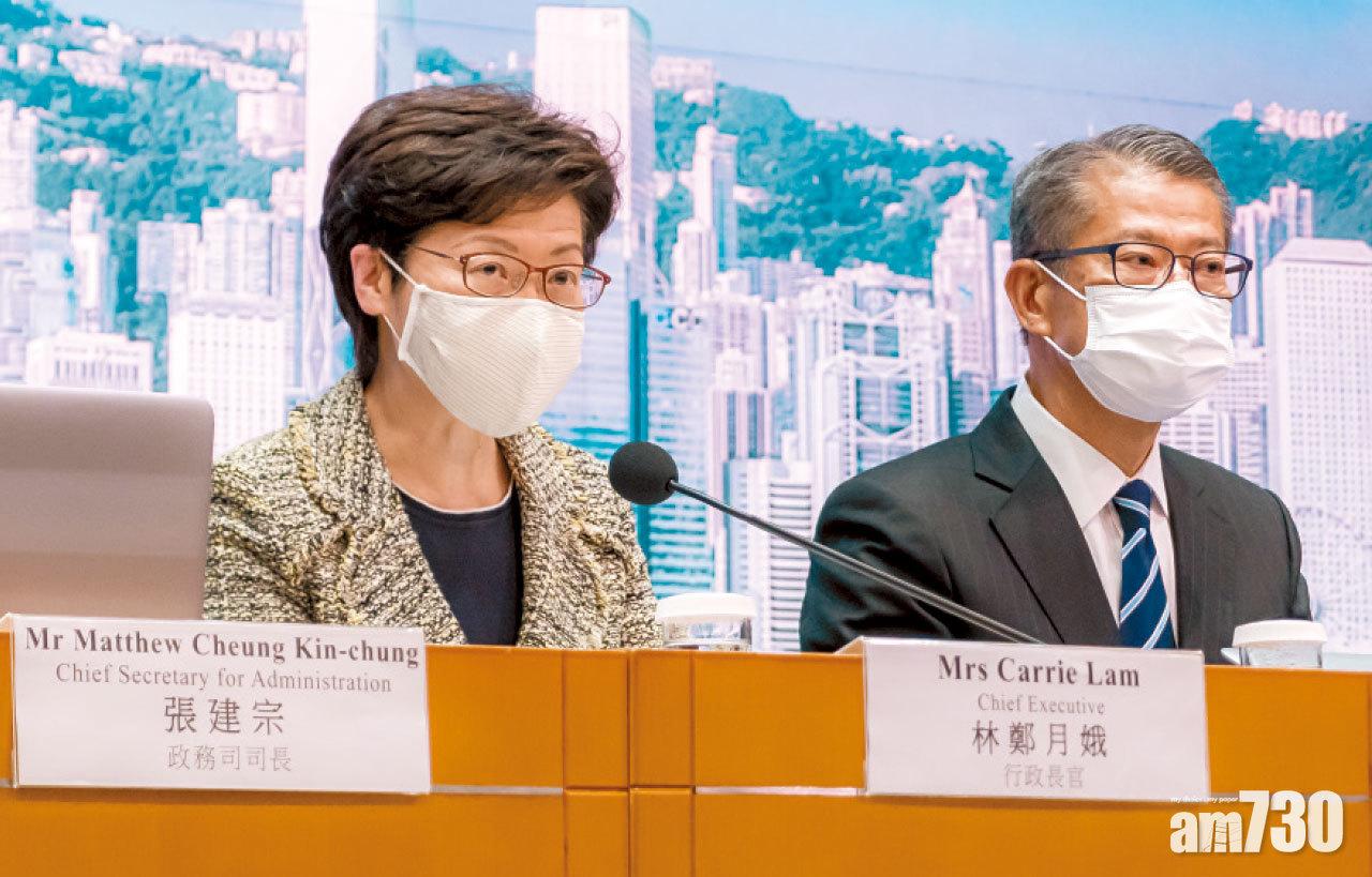 林鄭月娥(左)冀逐步恢復正常生活和商業活動;旁為陳茂波。(莊振邦攝)