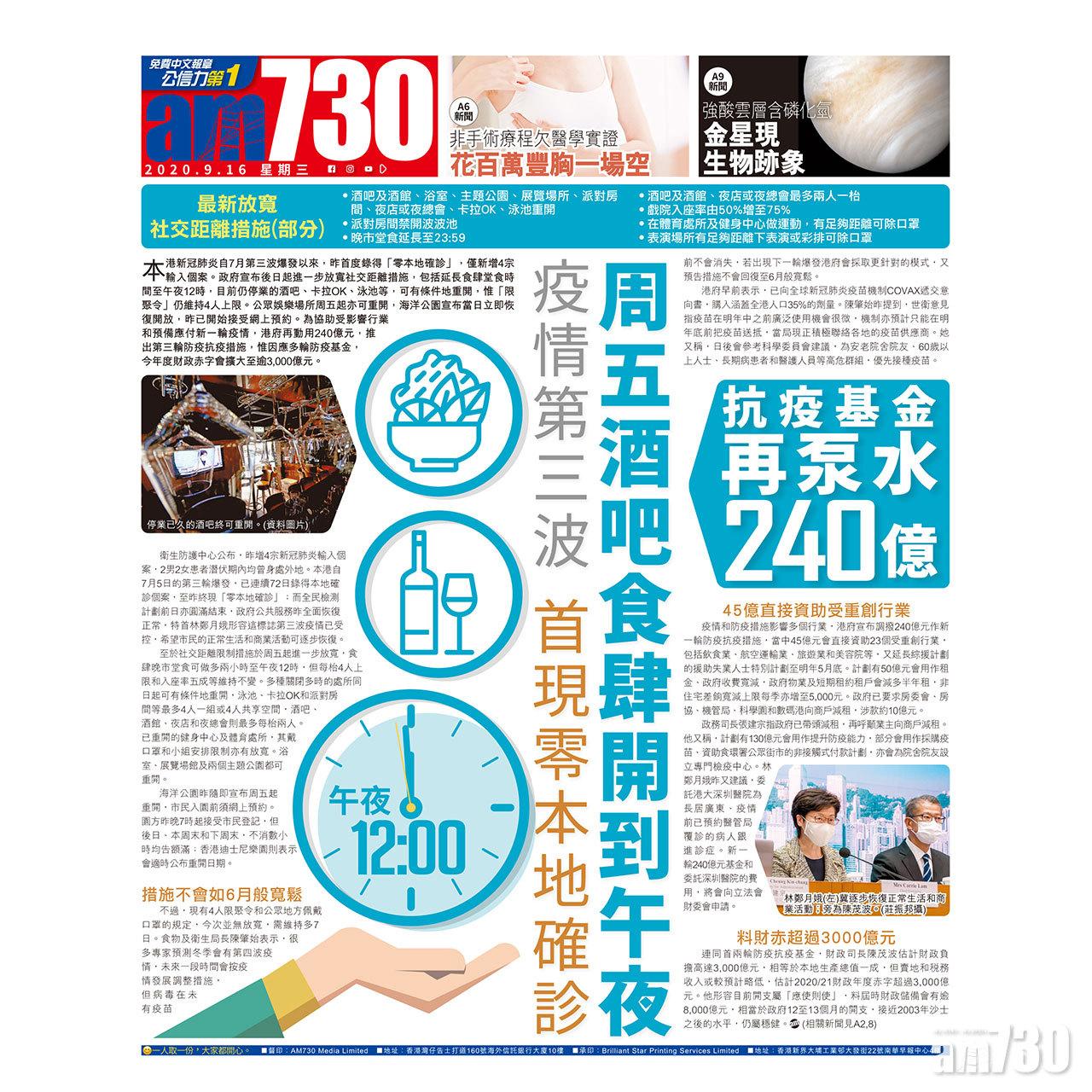 本港新冠肺炎自7月第三波爆發以來,昨首度錄得「零本地確診」,僅新增4宗輸入個案。政府宣布後日起進一步放寬社交距離措施,包括延長食肆堂食時間至午夜12時,目前仍停業的酒吧、卡拉OK、泳池等,可有條件地重開,惟「限聚令」仍維持4人上限。公眾娛樂場所周五起亦可重開,海洋公園宣布當日立即恢復開放,昨已開始接受網上預約。為協助受影響行業和預備應付新一輪疫情,港府再動用240億元,推出第三輪防疫抗疫措施,惟因應多輪防疫基金,今年度財政赤字會擴大至逾3,000億元。