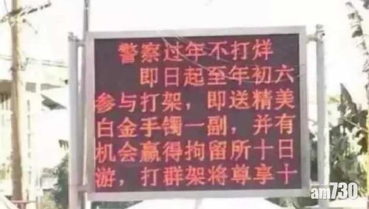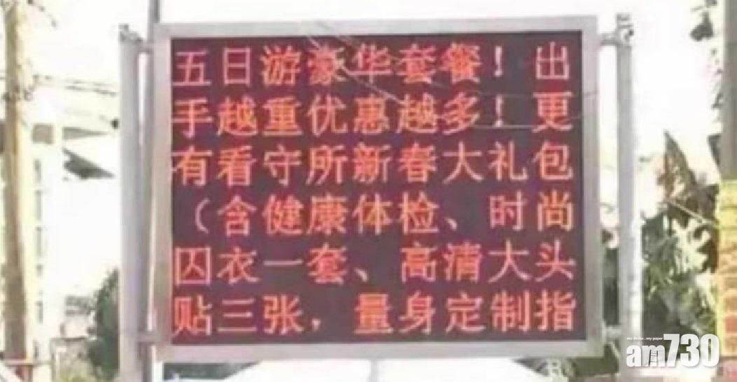 執法部門若以籠統字眼,警告違法市民會被判罰款,甚至坐監,對一些人而言阻嚇力或不足,但側面「勸導」、或具體表達犯法後果,可能更具警惕。內地網民分享在市面看到的呼籲,包括「騎摩托車(電單車)請戴好頭盔,否則,開寶馬同學會認出您」、「年底案件高發,慎防誤入傳銷騙局、別因為現在沒錢就去冒險,畢竟,以後沒錢的日子還多」;「警察過年不打烊,即日起至年初六參與打架,即送精美白金手鐲一副,並有機會贏得拘留所十日遊,打群架將尊享十五日遊豪華套餐!出手越重優惠越多!更有看守所新春大禮包(含健康體檢、時尚囚衣一套、高清大頭貼(相)三張、量身定制指紋卡一張,專車接送,食宿全包,免費精剪時尚髮型,還附贈一項實用手工技能喲。)!」