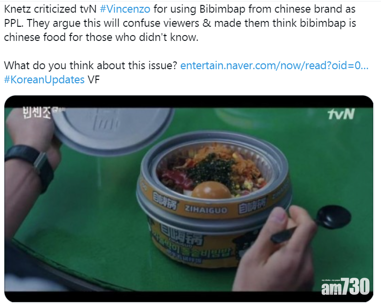 去年底中國與南韓網民因為「泡菜」的國際標準認證風波,在社交網爆發口水戰。最新戰情燒至韓式拌飯,正在熱播的韓劇《黑道律師文森佐》(Vincenzo),飾演文森佐的男星宋仲基與女主角食杯裝韓式拌飯,細心一看那是中國牌子「自嗨锅」的產品,隨即惹來南韓觀眾不滿,「這個中國韓式拌飯植入式產品是甚麼?現在他們(中國人)將會爭拗韓式拌飯是中國菜式了」。