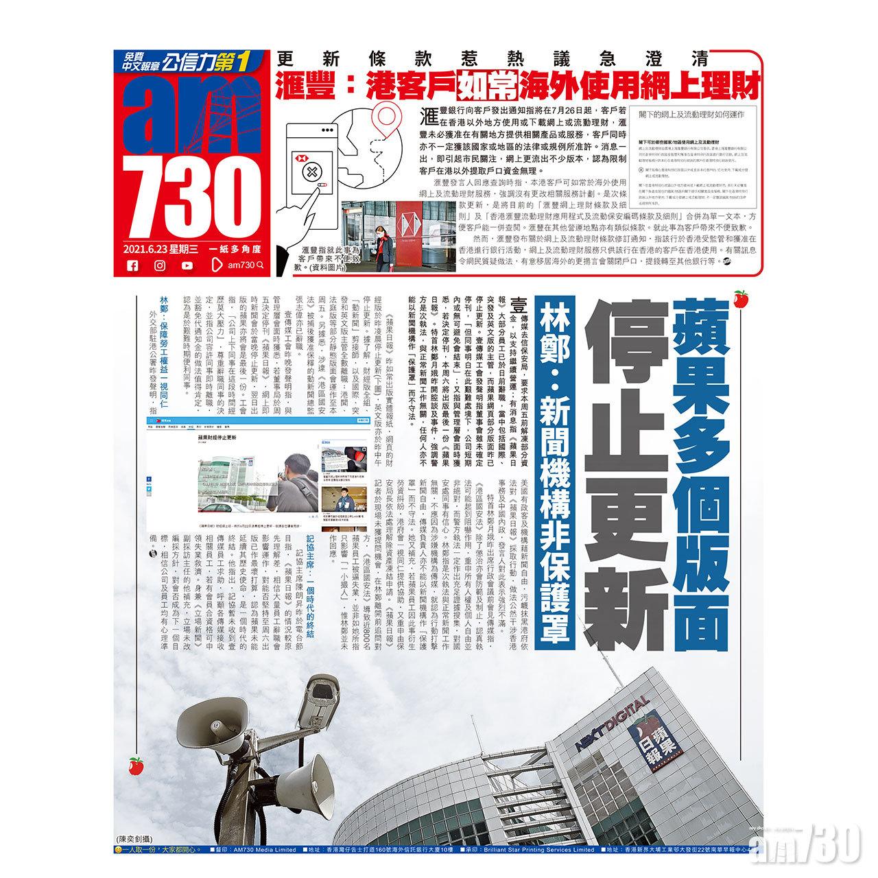 壹傳媒去信保安局,要求本周五前解凍部分資金,以支持繼續營運;有消息指《蘋果日報》大部分員工已於日前辭職,當中包括國際、突發及英文版的主管,而蘋果網頁部分版面昨已停止更新。壹傳媒工會發聲明指董事會雖未確定停刊,「但同事明白在此艱難處境下,公司短期內或無可避免會結束」;又指與管理層會面時獲悉,若決定停刊,本周六將出版最後一份《蘋果日報》。特首林鄭月娥昨開腔談及事件,強調警方是次執法,與正常新聞工作無關,任何人亦不能以新聞機構作「保護罩」而不守法。