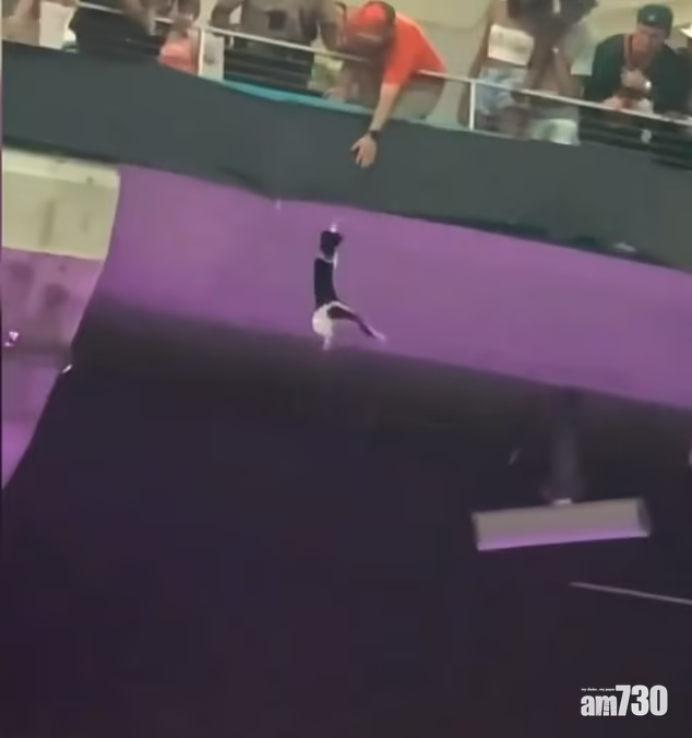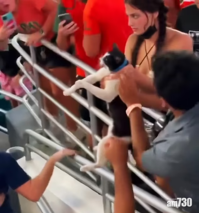 美國邁亞密昨日一場美式足球比賽,全場球迷屏息觀看的並非球賽,而是看台上方半空,皆因一隻貓咪離奇地懸掛在上層看台外的半空中。目擊者稱,貓咪初時兩隻前掌抓著掛在看台外的布邊,之後只剩一隻前掌抓著,快將掉下來。片段可見貓咪驚恐地在半空中爭扎,在場人士看得膽戰心驚,上層看台的人也嘗試抓著牠,惟貓咪最後仍急速墮下,球迷見狀發出尖叫聲。有醒目球迷立即張開手上的美國國旗,雖然最後未能接住貓咪,但牠踫到國旗反彈墮地也減少了衝力,全場球迷見牠獲救都發出歡呼聲。