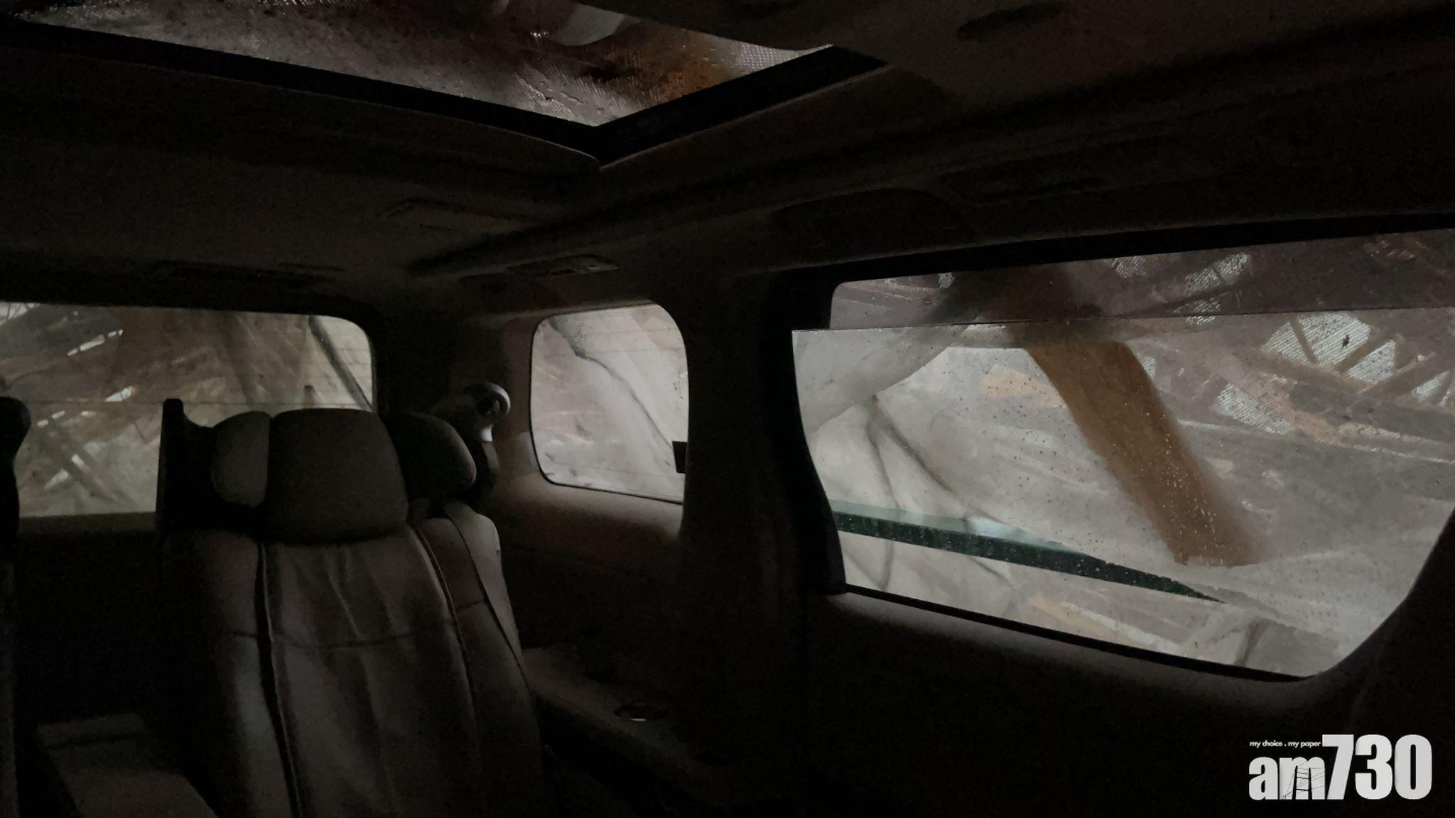 被棚架倒塌壓住的車輛內部照片。