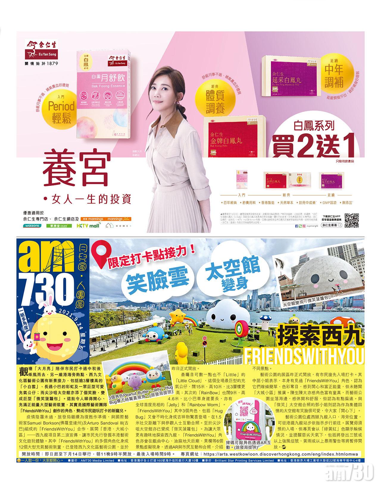觀塘「大月亮」陪伴市民打卡過中秋後乘風而去,另一維港海旁熱點、西九文化區藝術公園有新景接力,包括逾3層樓高的「小白雲」、長過小巴的彩虹及一眾巨型可愛充氣公仔;而尖沙咀太空館亦添了個笑臉,變成巨型「微笑菠蘿包」。這批令人睇得開心、充滿正能量大型藝術裝置,其實是國際藝術團隊「FriendsWithYou」創作的角色,勢成市民遊玩打卡的新寵兒。