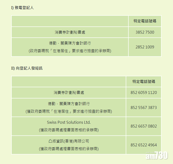 6組特定電話號碼 (消費券計劃網站截圖)