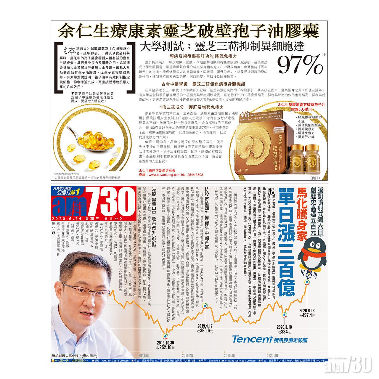 股王又發威!憂慮第二波「疫市」殺到,受惠「宅經濟」的環球科網股再噴射式爆升,騰訊控股(700)連升6個交易日錄今年最長升浪,高見498.6元歷史新高,單計昨日已飆半成,市值單日漲2,216億元,等於4間東亞銀行(023),最新市值4.75萬億元,為6間滙豐控股(005)總和。按福布斯實時富豪榜顯示,創辦人兼主席馬化騰身家昨日一度增38億美元(約296.4億港元),平均每分鐘進帳2千萬元,至553億美元(約4,313億港元),大幅拋離阿里巴巴(9988)創辦人馬雲的440億美元(約3,432億港元)身家,穩坐中國首富寶座,並為全球第14大富豪。