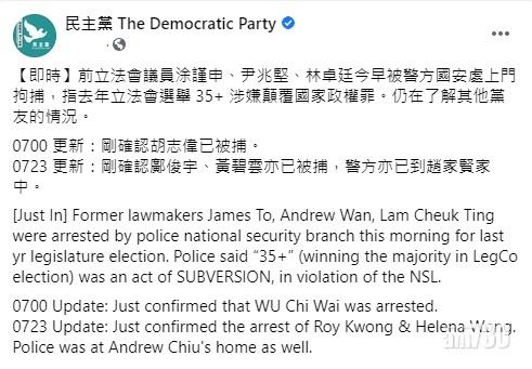 民主黨在社交網站表示,立法會前議員胡志偉、涂謹申、尹兆堅、林卓廷,今早被警方國安處人員上門拘捕,指他們參與去年民主派初選,涉嫌顛覆國家政權罪。