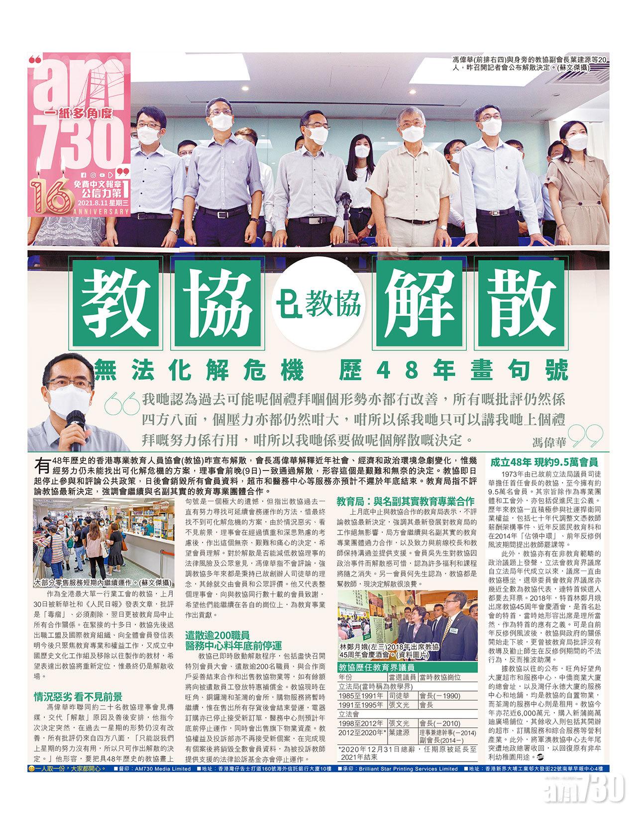 有48年歷史的香港專業教育人員協會(教協)昨宣布解散,會長馮偉華解釋近年社會、經濟和政治環境急劇變化,惟幾經努力仍未能找出可化解危機的方案,理事會前晚(9日)一致通過解散,形容這個是艱難和無奈的決定。教協即日起停止參與和評論公共政策,日後會銷毀所有會員資料,超市和醫務中心等服務亦預計不遲於年底結束。教育局指不評論教協最新決定,強調會繼續與名副其實的教育專業團體合作。