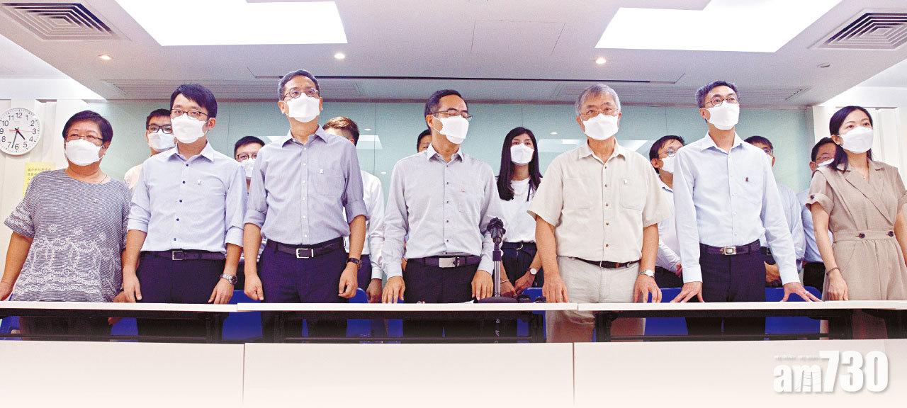 馮偉華(前排右四)與身旁的教協副會長葉建源等20人,昨召開記者會公布解散決定。(蘇文傑攝)