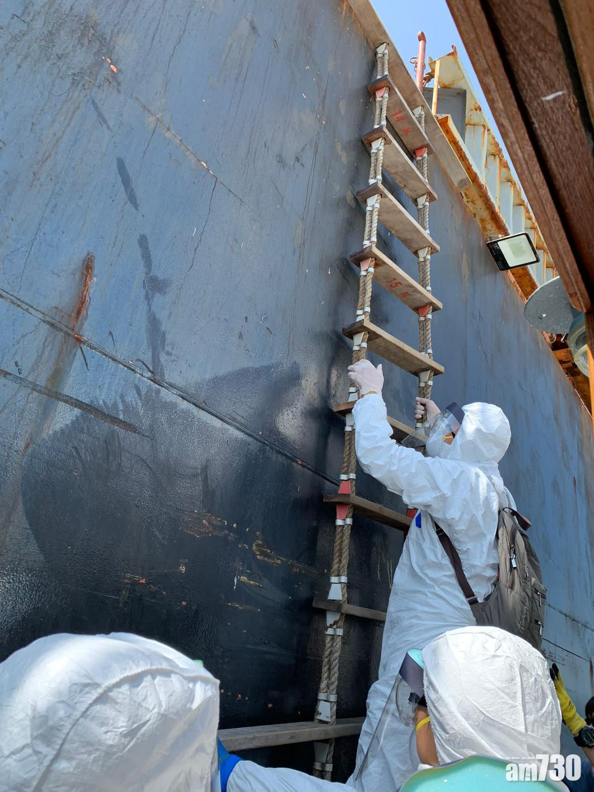 爆疫印尼貨船涉虛假陳述,警夥衛生署登船蒐證。(警方提供)