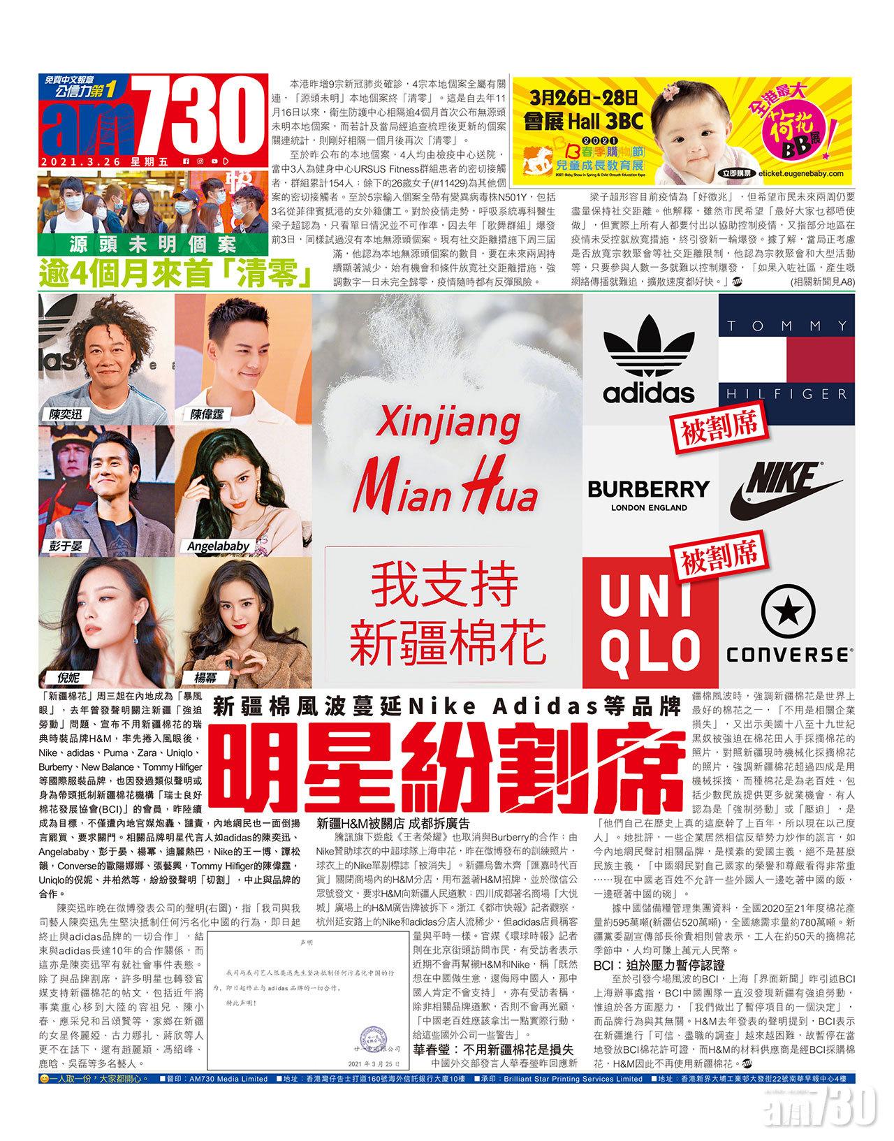 「新疆棉花」周三起在內地成為「暴風眼」,去年曾發聲明關注新疆「強迫勞動」問題、宣布不用新疆棉花的瑞典時裝品牌H&M,率先捲入風眼後,Nike、adidas、Puma、Zara、Uniqlo、Burberry、New Balance、Tommy Hilfiger等國際服裝品牌,也因發過類似聲明或身為帶頭抵制新疆棉花機構「瑞士良好棉花發展協會(BCI)」的會員,昨陸續成為目標,不僅遭內地官媒炮轟、譴責,內地網民也一面倒揚言罷買、要求關門。相關品牌明星代言人如adidas的陳奕迅、Angelababy、彭于晏、楊冪、迪麗熱巴,Nike的王一博、譚松韻,Converse的歐陽娜娜、張藝興,Tommy Hilfiger的陳偉霆,Uniqlo的倪妮、井柏然等,紛紛發聲明「切割」,中止與品牌的合作。