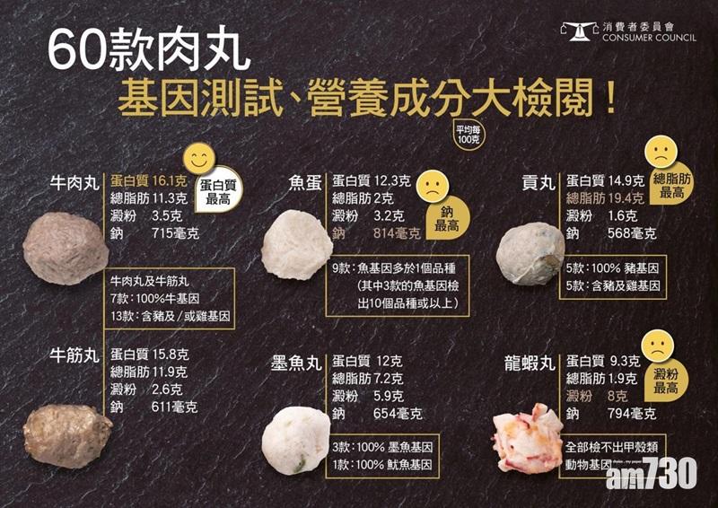 肉丸是不少港人火鍋或午餐的常見食材。然而,消委會測試市面上5類共60款預先包裝及散裝的肉丸樣本,當中七成半(45款)肉丸樣本屬「高鈉」食物,以魚蛋類樣本檢出的平均鈉含量最高,進食一碗魚蛋粉(5粒魚蛋計),單是魚蛋的鈉含量已佔世衛建議每日鈉攝取量上限的41%。同時,消委會首次對肉丸進行基因測試,發現全部龍蝦丸樣本均檢不出甲殼類動物基因,當中有樣本在成分表標示含龍蝦;測試又發現,有六成(12款)牛肉丸或牛筋丸樣本檢出豬的基因,其中兩款樣本的豬基因比例更超過50%。