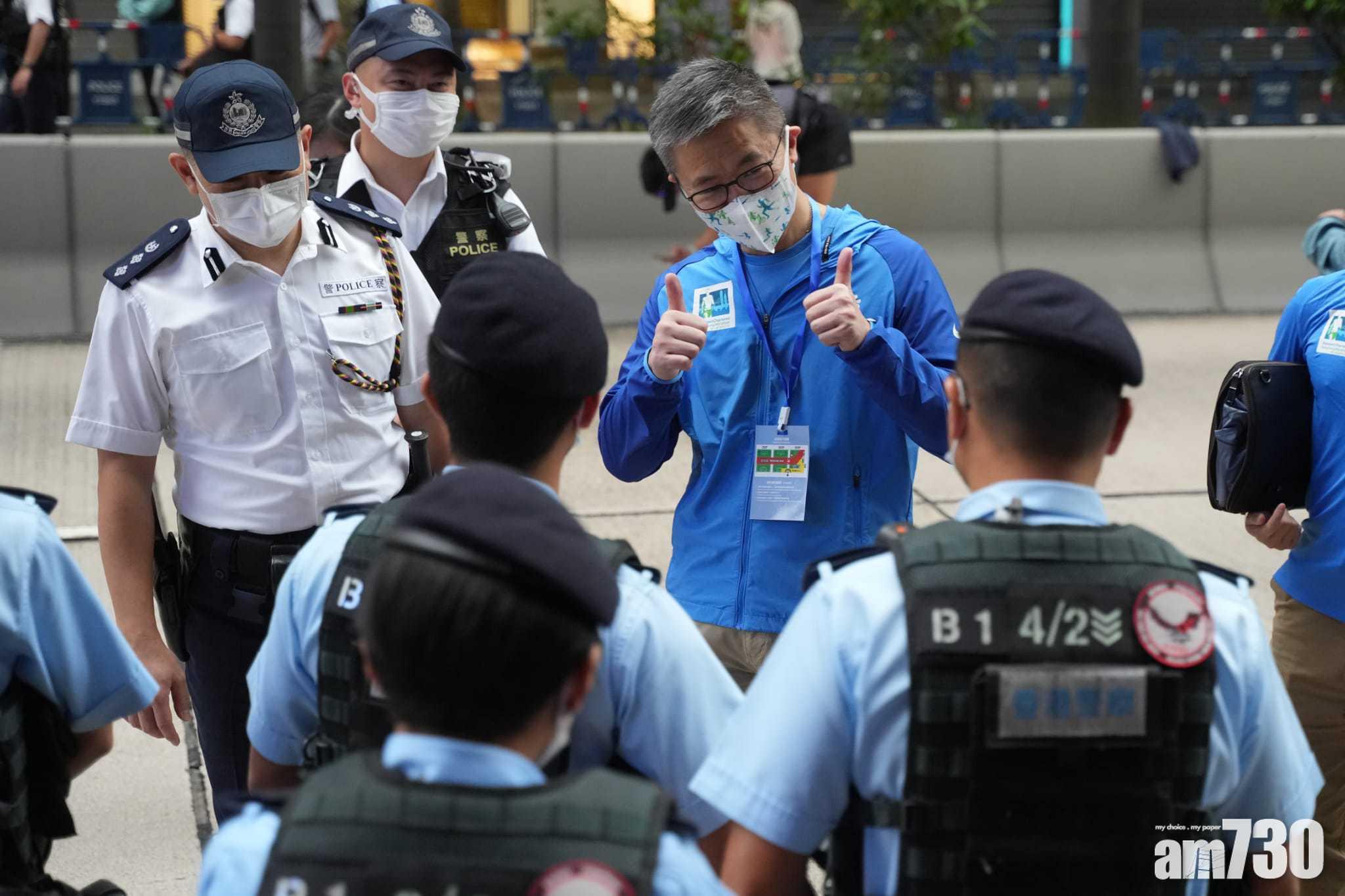 蕭澤頤(深藍衣者)為執勤中的警員打氣。(陳奕釗攝)