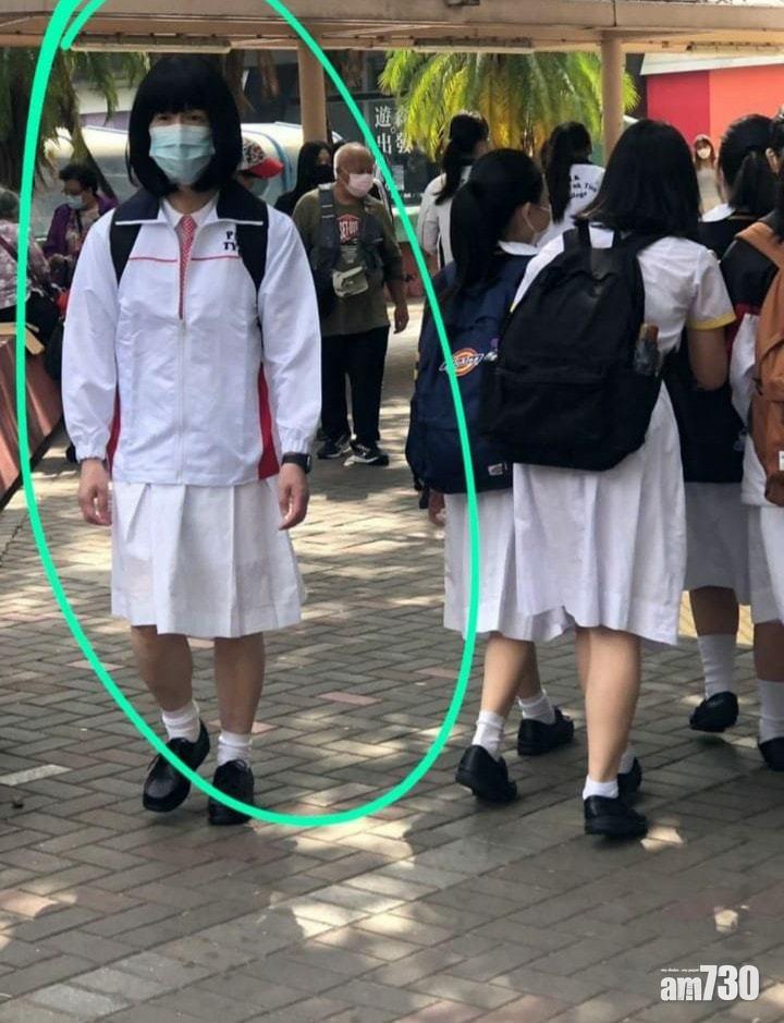 女校男生雖不是陌生的概念,但網上近日流傳有中年男子身穿一套校服裙,並在屯門區內徘徊。有關圖片昨日在網上流傳,顯示屯門蝴蝶邨蝶意樓附近,有一名身穿屯門保良局董玉娣中學女裝校服的男子,他頭髮及肩,身穿校裙和印有該校校名英文簡寫的外套,由於他本身戴着口罩,遠看或不會察覺到異樣。