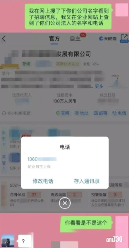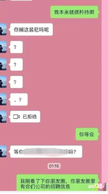 部分人會透過即時通訊軟件識陌生朋友,但內地網民帖文「沒事千萬別用微信撩附近的人,看看這就是下場」,當中樓主貼出微博對話,開始時一名男子凌晨1時許問「在嗎?自己在家?喜歡腹肌?想不想看哥的腹肌?」樓主只是嗯嗯嗯敷衍回應,但明確稱不想看對方腹肌。而男子繼續發功「別給臉不要臉?你是尼姑?你不需要在我這裝矜持,請你解放天性……」樓主仍不大理會對方;及至男子想要用視像聯絡樓主遭拒,樓主著男子「等會」,之後火速透過看男子微信朋友圈內資料,知悉男子姓名、在甚麼公司工作,公司的聯絡方法等,並告之男子她已掌握其資料,著男子不要繼續騷擾她,否則會將對話截圖發給男子的公司。