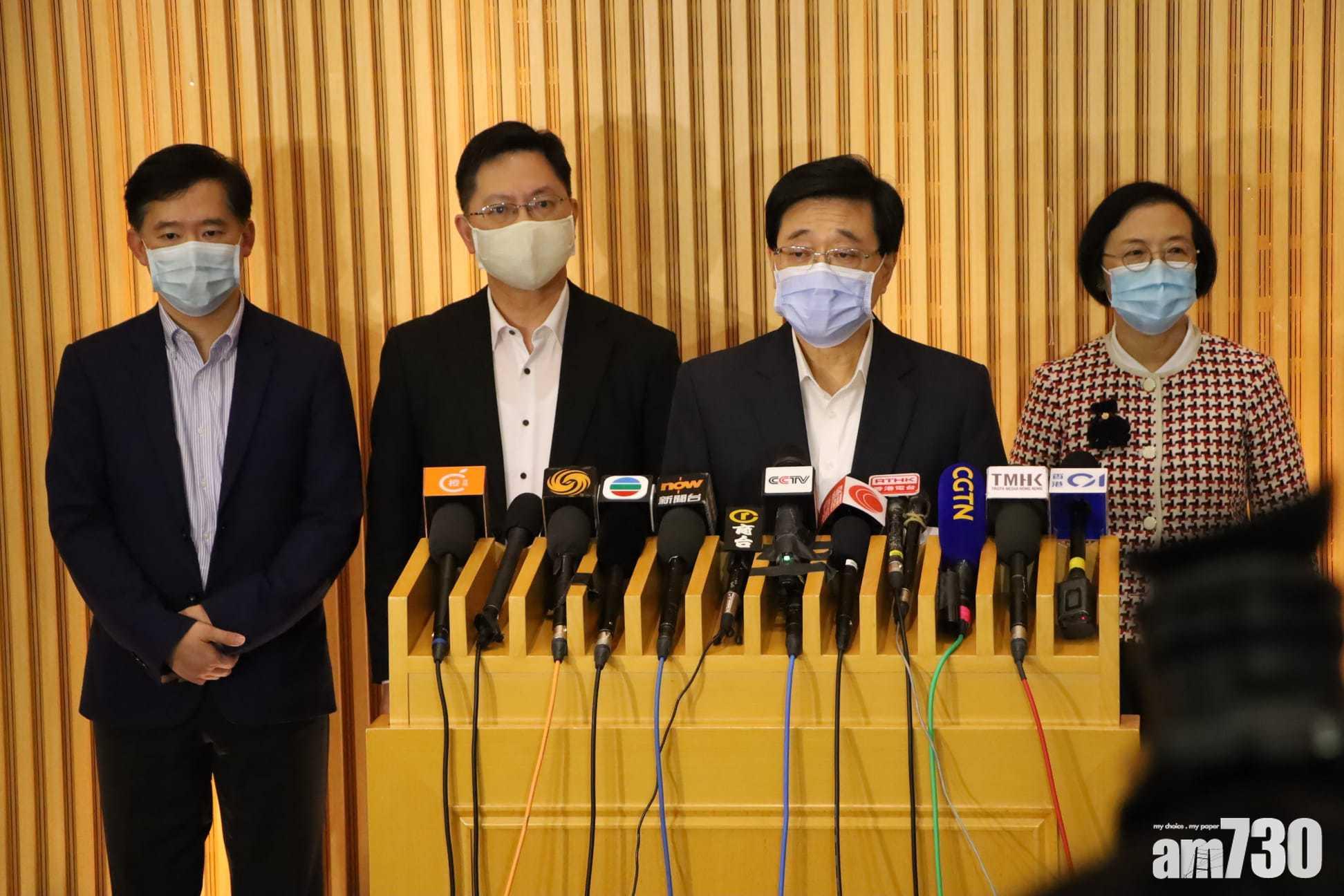 李家超(左三)、陳肇始(左四)和薛永恒(左二)等官員晚上從深圳返港後,交代與內地專家通關會議的進展。(鍾式明攝)