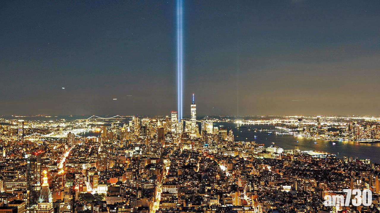 世貿遺址亮起「紀念之光」以悼念死難者,兩道光柱直射往6.4公里上空。(路透社)