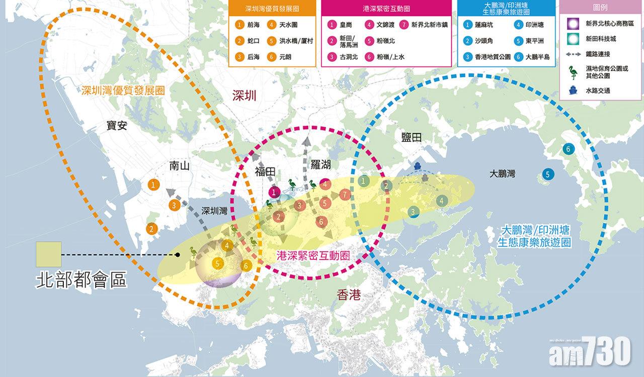 政府就北都編製《北部都會區發展策略》報告書,是首份由港府編製跨越港深兩地行政界線的策略及綱領,並以「雙城三圈」(三圈:深圳灣優質發展圈、港深緊密互動圈、大鵬灣/印洲塘生態康樂旅遊圈)為空間格局(詳見A6),已充分考慮中央政府的「十四五規劃」。北都亦會以5條鐵路作運輸系統的主要骨幹,是為「運輸基建先行」的發展概念,當中有3線貫穿深港兩地(詳見A4)。