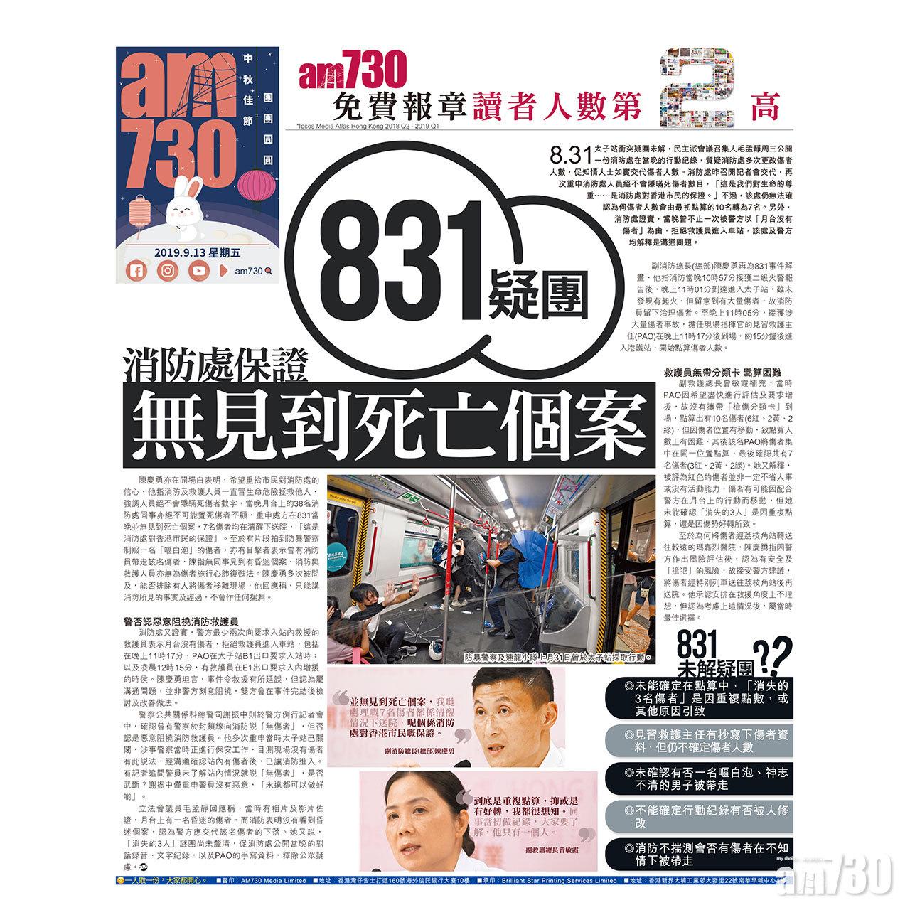 副消防總長(總部)陳慶勇再為831事件解畫,他指消防當晚10時57分接獲二級火警報告後,晚上11時01分到達進入太子站,雖未發現有起火,但留意到有大量傷者,故消防員留下治理傷者。至晚上11時05分,接獲涉大量傷者事故,擔任現場指揮官的見習救護主任(PAO)在晚上11時17分後到場,約15分鐘後進入港鐵站,開始點算傷者人數。