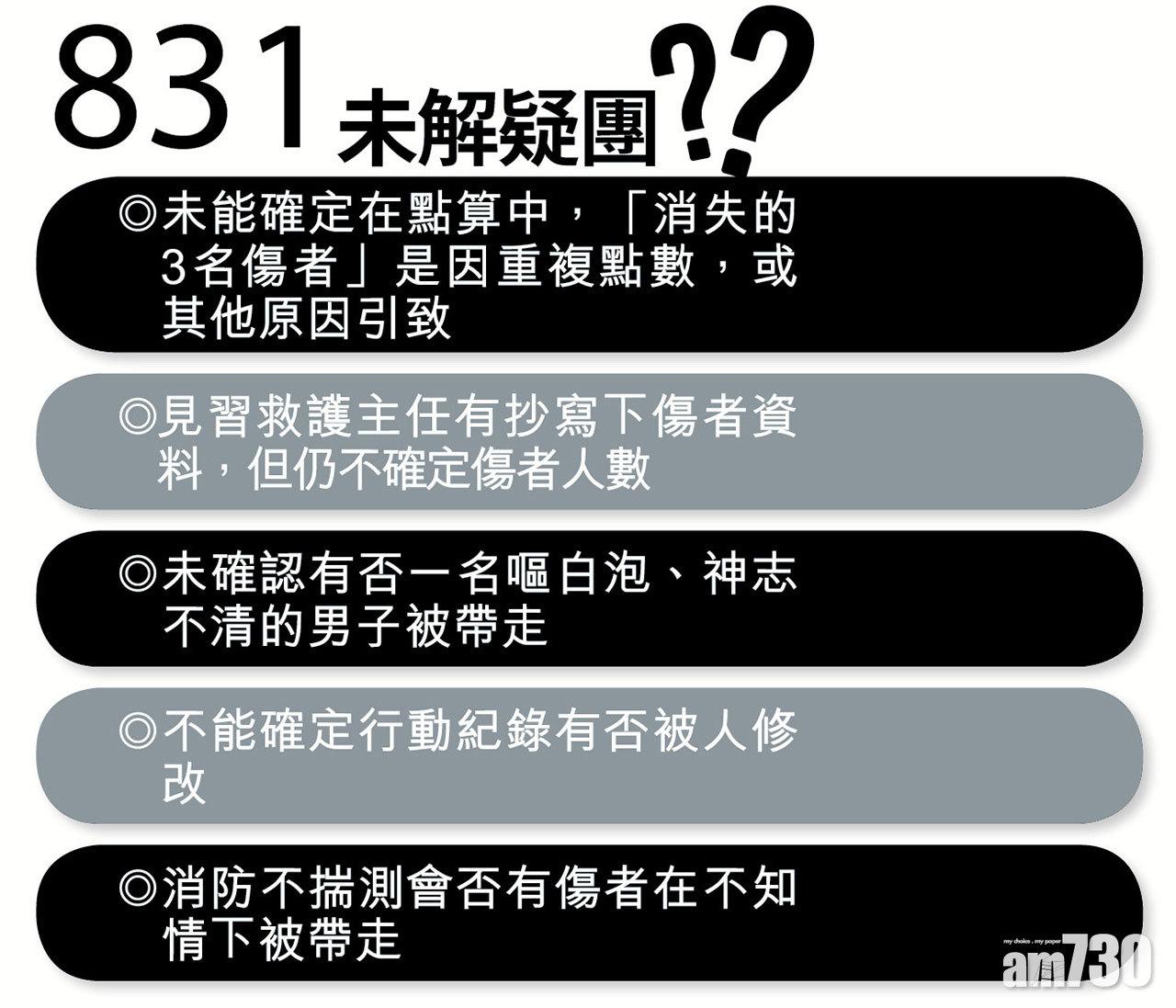 8.31太子站衝突疑團未解,民主派會議召集人毛孟靜周三公開一份消防處在當晚的行動紀錄,質疑消防處多次更改傷者人數,促知情人士如實交代傷者人數。消防處昨召開記者會交代,再次重申消防處人員絕不會隱暪死傷者數目,「這是我們對生命的尊重……是消防處對香港市民的保證。」不過,該處仍無法確認為何傷者人數會由最初點算的10名轉為7名。另外,消防處證實,當晚曾不止一次被警方以「月台沒有傷者」為由,拒絕救護員進入車站,該處及警方均解釋是溝通問題。