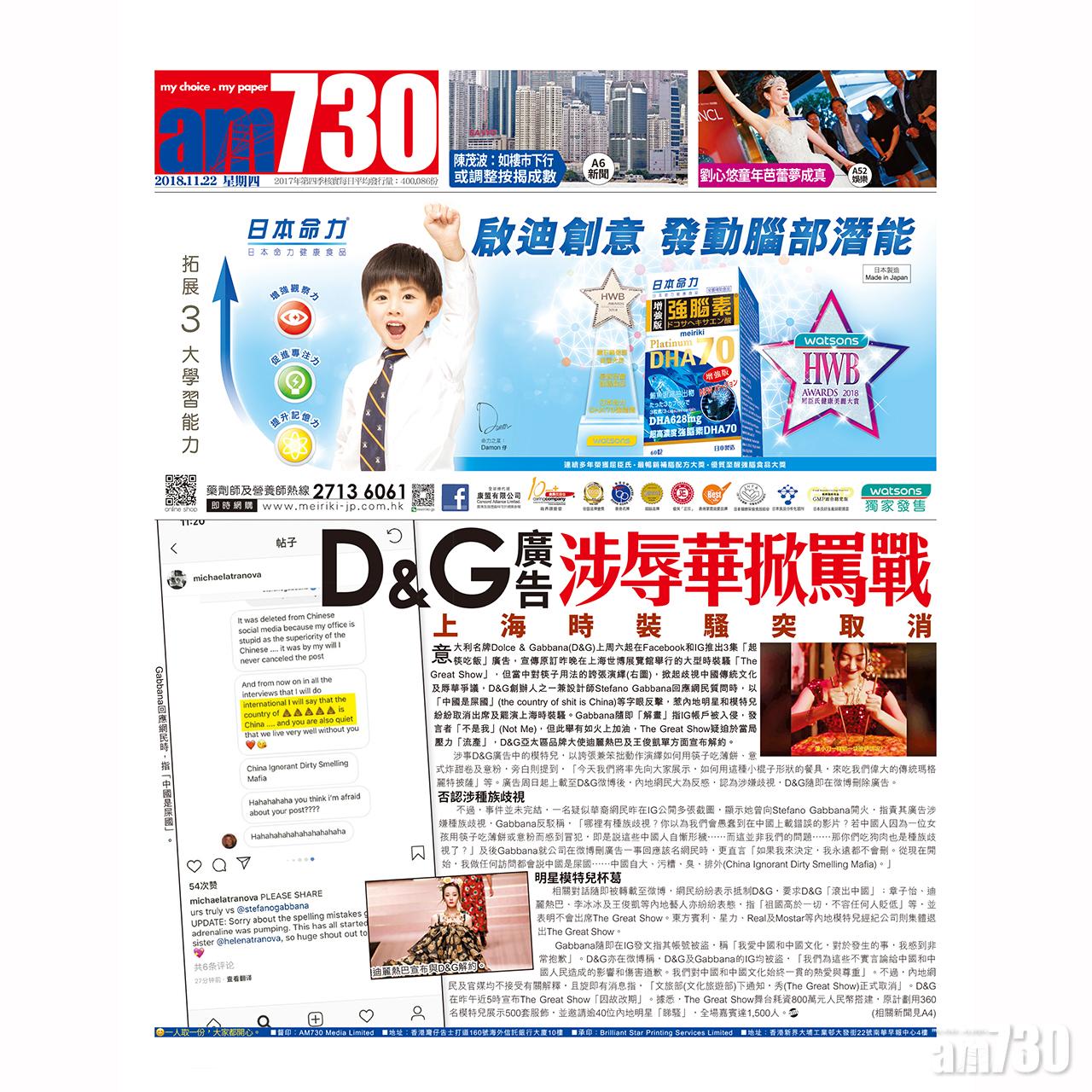 意大利名牌Dolce & Gabbana(D&G)上周六起在Facebook和IG推出3集「起筷吃飯」廣告,宣傳原訂昨晚在上海世博展覽館舉行的大型時裝騷「The Great Show」,但當中對筷子用法的誇張演繹(圖2),掀起歧視中國傳統文化及辱華爭議,D&G創辦人之一兼設計師Stefano Gabbana回應網民質問時,以「中國是屎國」(the country of shit is China)等字眼反擊,惹內地明星和模特兒紛紛取消出席及罷演上海時裝騷。Gabbana隨即「解畫」指IG帳戶被入侵,發言者「不是我」(Not Me),但此舉有如火上加油,The Great Show疑迫於當局壓力「流產」,D&G亞太區品牌大使迪麗熱巴及王俊凱單方面宣布解約。