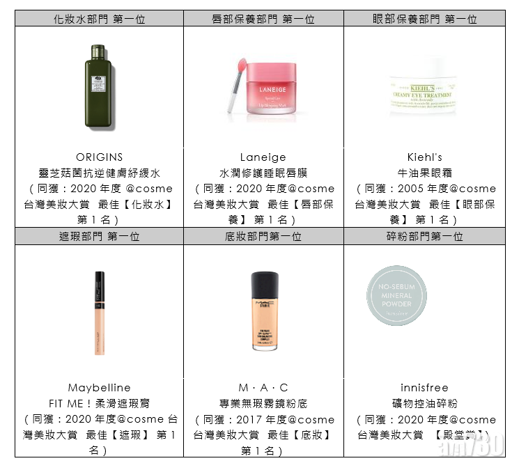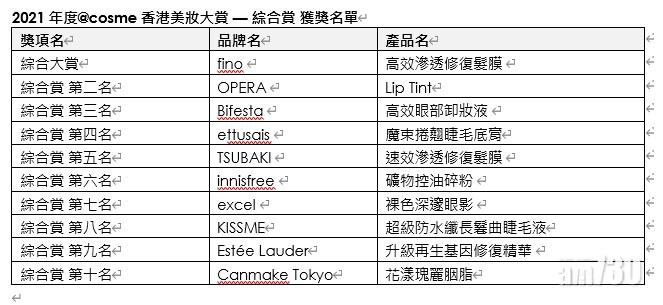 2021年度@cosme香港美妝大賞 — 綜合賞 獲獎名單