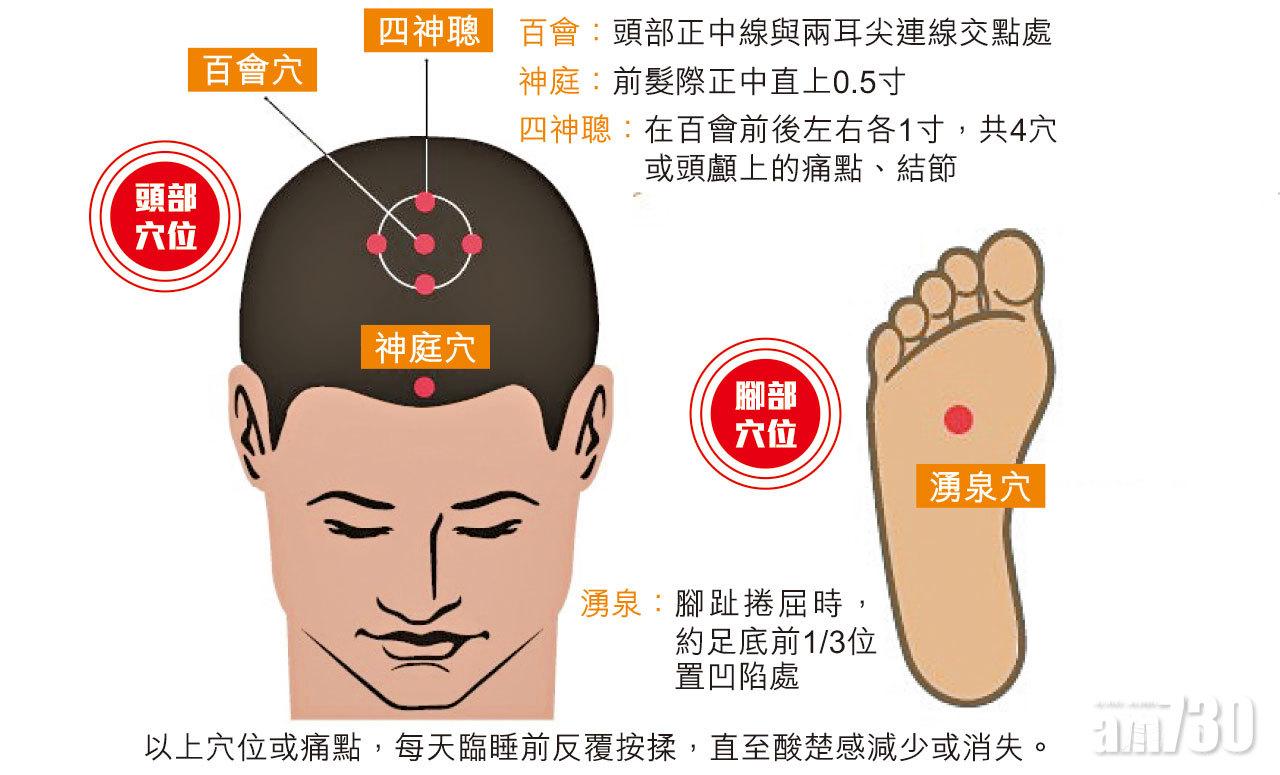 中醫稱失眠為「不寐」,指經常不能獲得正常睡眠為特徵的一種病證,即持續地睡眠質素變差。註冊中醫師李上琦指,不寐的成因眾多,包括生理和心理的因素。心理方面,有一說法是「抑鬱的人比較難入睡,焦慮的人多早醒」,思慮過多、易怒、緊張、負面思想較多的人比較容易失眠。而生理方面,臟腑失調都會引致睡眠質素變差,如久病身體虛弱、心虛膽怯易驚、肝氣鬱結或陰虛陽亢等。另一個常見的情況是飲食不節,《素問.逆調論篇》有「胃不和則臥不安」一說,指胃部不適多脹氣,亦會影響睡眠。李醫師推薦受不寐困擾人士可嘗試以下穴位按摩法,適合任何體質或身體狀況,有助提升睡眠質素。