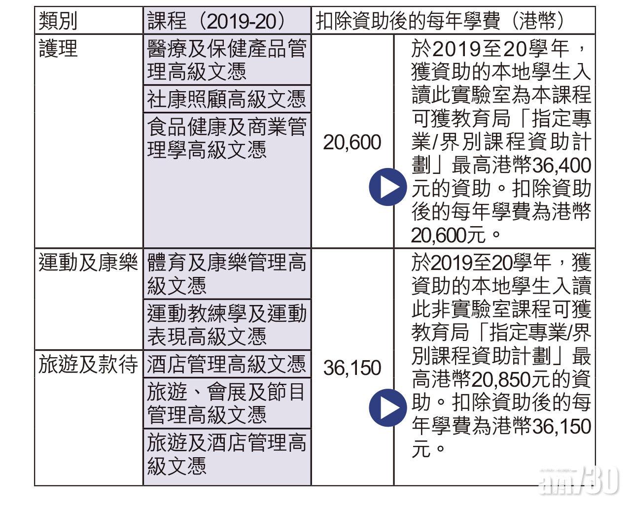 由2019至20學年,8個高級文憑課程共760個學額獲納入「指定專業/界別課程資助計劃」,涵蓋「護理」、「運動及康樂」及「旅遊及款待」三大範疇。在該計劃下,同學只須支付扣除政府資助後的學費,詳情如下︰