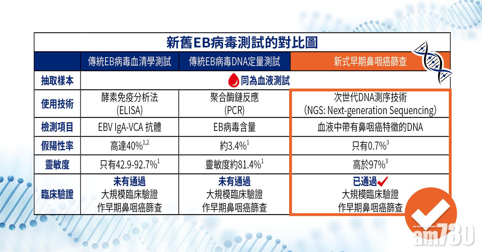 隨著醫學不斷進步,新式篩查加入了次世代DNA測序技術,能更有針對性地檢驗血液中帶有鼻咽癌特徵的DNA,比傳統只檢驗EB病毒感染的測試具更高的準確性。換言之,若體內存在鼻咽癌,即使未見明顯病徵,新式篩查也能有效找出早期的鼻咽癌患者,當中靈敏度高達97%,假陽性率更低至0.7%,屬一大突破。