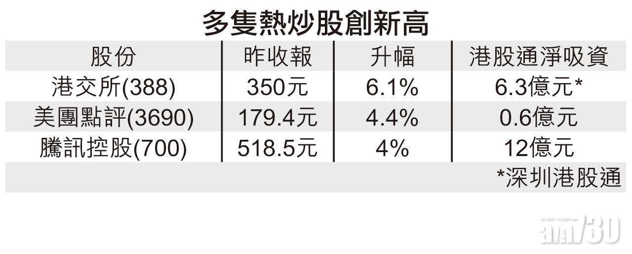 北水連日南下掃貨,昨深圳港股通淨流入34.48億元,上海港股通則吸資16.37億元,兩市淨買入騰訊12億元,深圳亦掃入6.3億元港交所,前者昨飆4%,至518.5元新高;後者狂漲6.1%,至350元再破頂。另一破頂股美團點評(3690)昨升4.4%,至179.4元,北水淨流入6,037萬元。