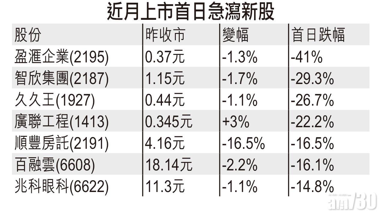 事實上,近期港股市況欠佳,統計最近上市的20隻新股中,有11隻首日已經破底,其中盈滙企業控股(2195)首日更大跌41%,表現最差,該股昨日收報0.37元,跌1.3%,即使重磅科技股,如百度集團(9888)及嗶哩嗶哩(9626)首日表現亦未如人意,分別無升跌及下滑1%,兩股昨日收報183元及759元,分別漲3.9%及7.6%,惟上市至今仍累瀉逾27%及6%。專家指,港股短期仍有機會向下尋底,京東物流估值亦較2月初時大幅減少,加上大型科技股調整後亦有好多選擇,京東物流上市初期有機會捱價,短炒宜控制注碼,該股將於周五截止認購,本月28日上市。