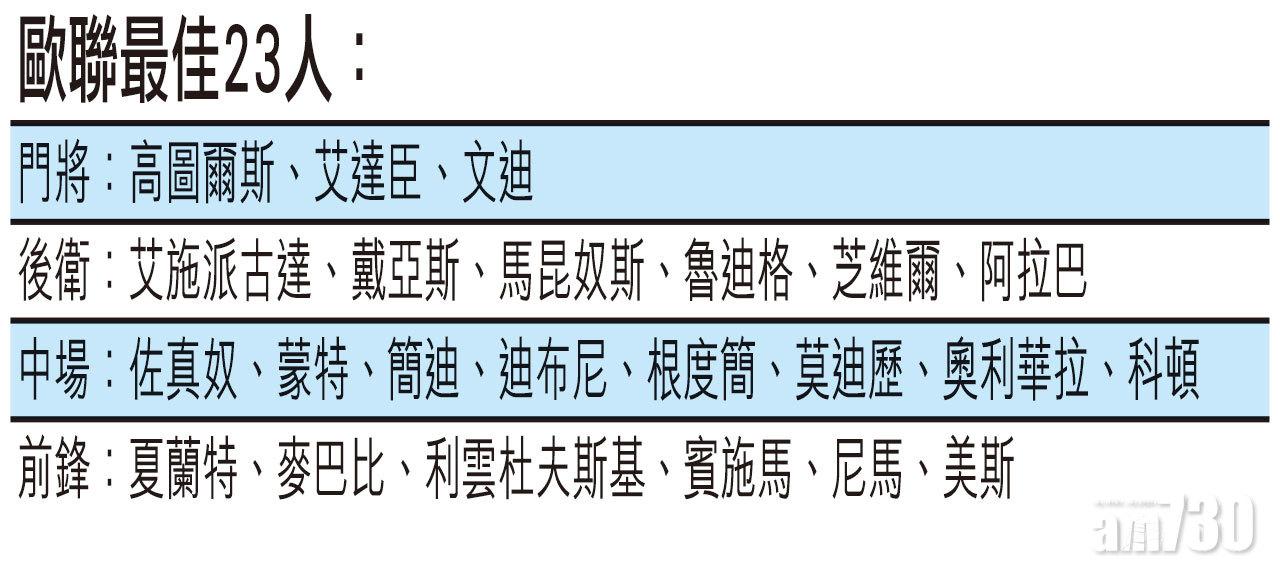 另一方面,歐洲足協近日公布了今屆歐聯最佳23人名單,其中以英格蘭國腳中場美臣蒙特為首的7名車路士冠軍成員均有份入選,而曼城新星國腳菲爾科頓亦在陣內。此外,另一焦點則是兩大球王美斯與基斯坦奴朗拿度,二人分別効力的巴塞隆拿與祖雲達斯同樣16強出局;但美斯仍在最佳23人之中,反而C朗則名落孫山,令人意外。