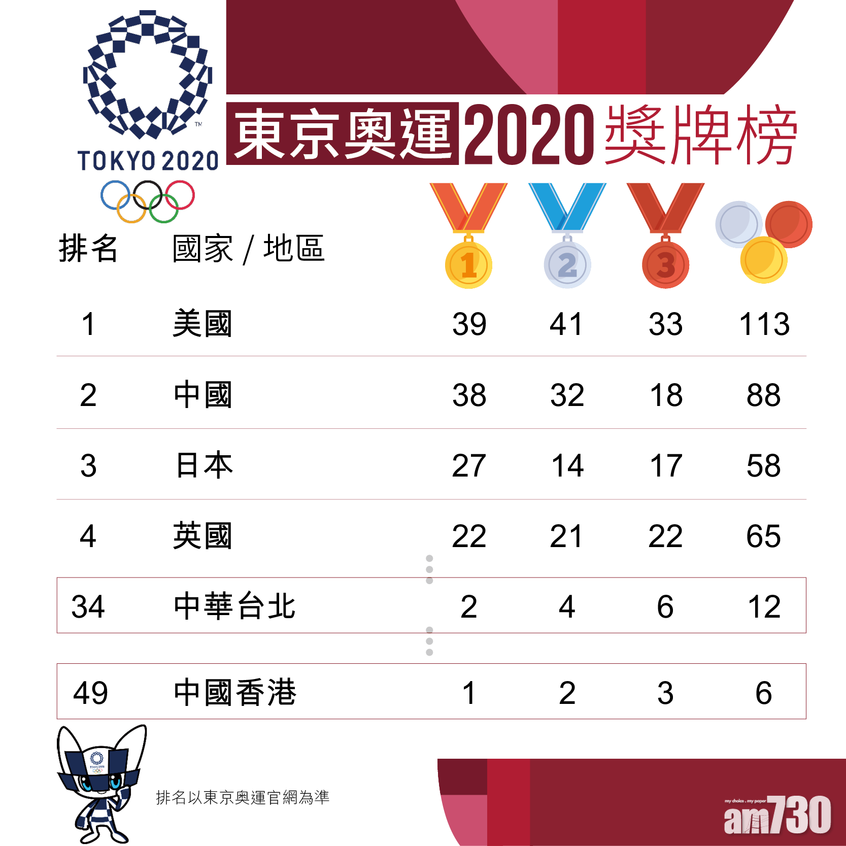 另一方面,美國在最後一個比賽日發力,除了奪得史上首個女排金牌外,也達成女子籃球「七連霸」,總共奪得39金41銀33銅,以1金之差力壓中國,登上獎牌榜榜首完成今屆奧運。值得一提的是,在最近3屆奧運中,美國在金牌以及總獎牌數量都冠絕所有國家。