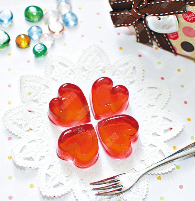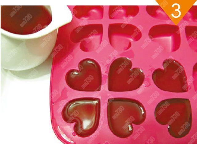 3.將混合液倒入心型模具中,凝結後放入雪櫃冷凍即成。