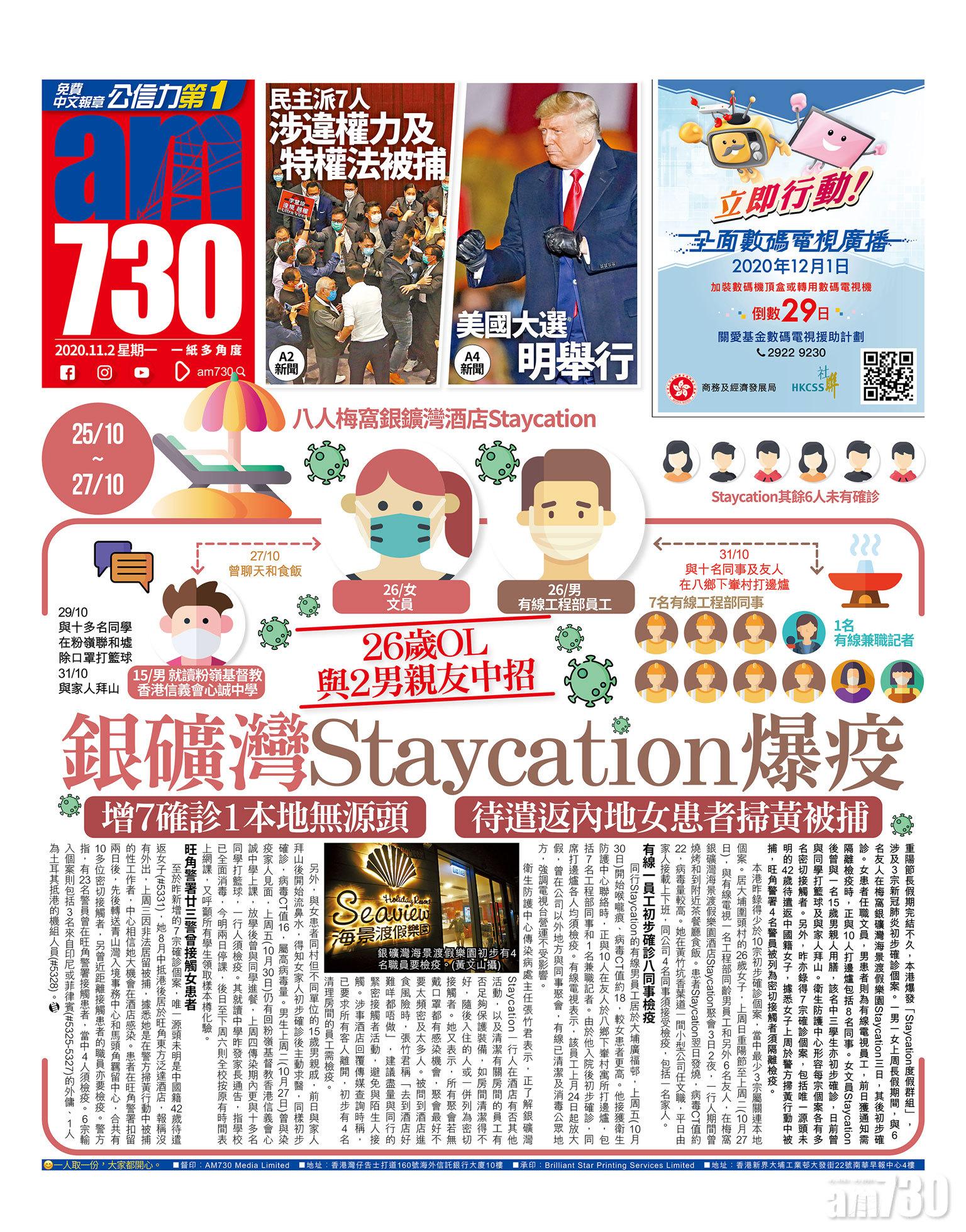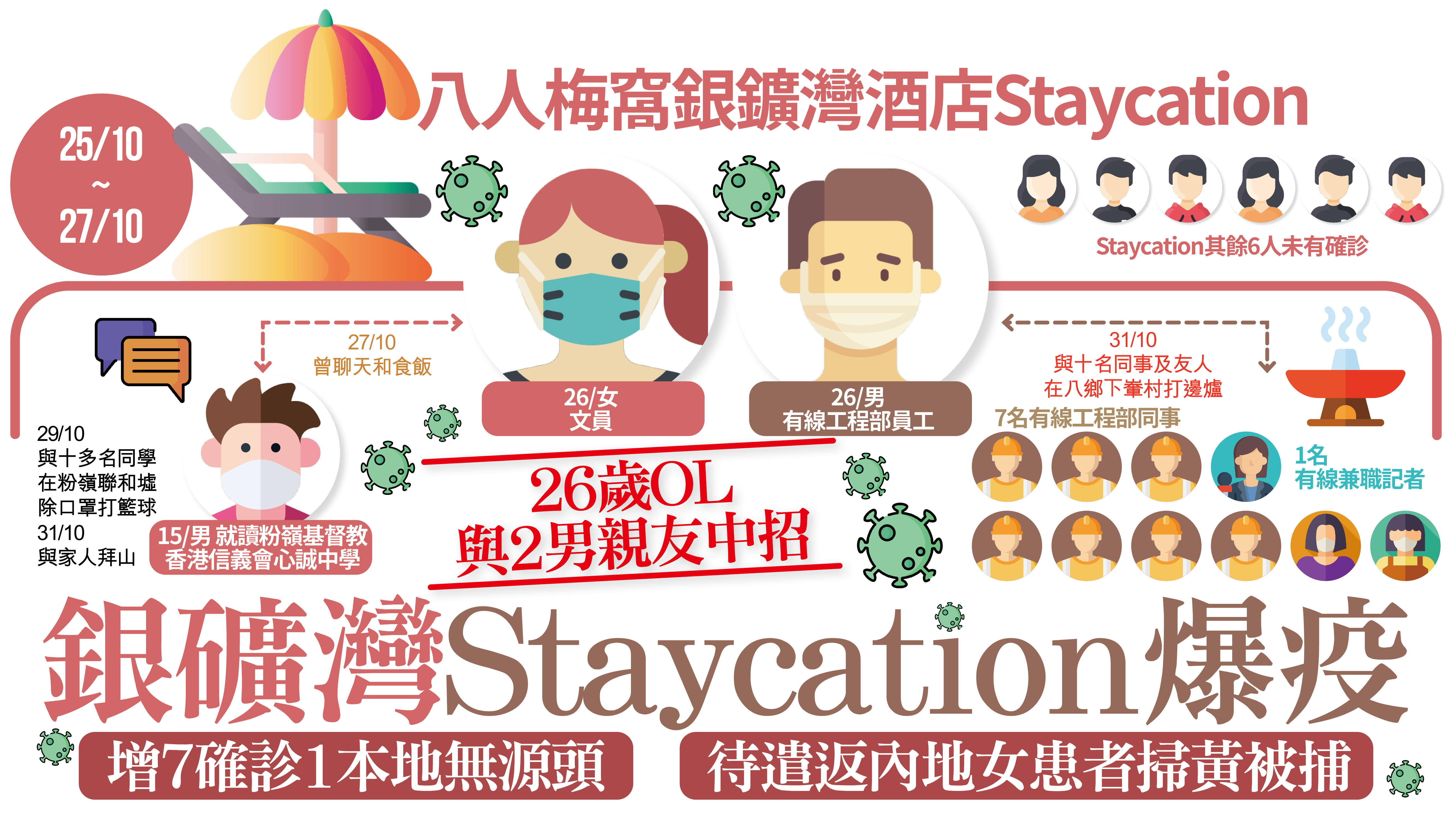 重陽節長假期完結不久,本港爆發「Staycation度假群組」,涉及3宗新冠肺炎初步確診個案。一男一女上周長假期間,與6名友人在梅窩銀礦灣海景渡假樂園Staycation三日,其後初步確診。女患者任職文員,男患者則為有線電視員工,前日獲通知需隔離檢疫時,正與10人打邊爐包括8名同事。女文員Staycation後曾與一名15歲男親人用膳,該名中三學生亦初步確診,日前曾與同學打籃球及與家人拜山。衛生防護中心形容每宗個案各有多名密切接觸者。另外,昨亦錄得7宗確診個案,包括唯一源頭未明的42歲待遣返中國籍女子,據悉女子上周於警方掃黃行動中被捕,旺角警署4名警員被列為密切接觸者須隔離檢疫。