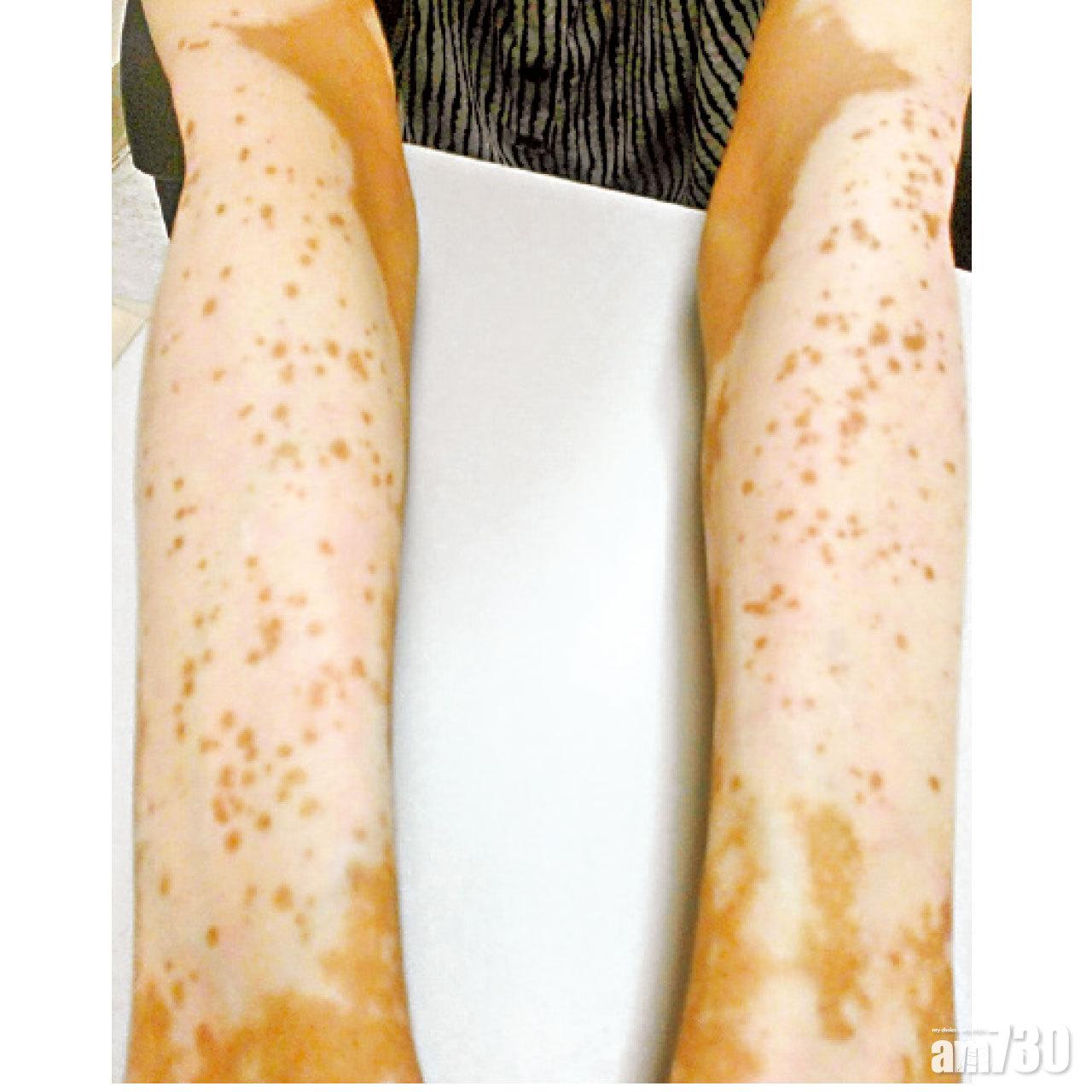 這個病似乎不影響一般生活,較少人會為此認真求醫。最近治療過兩個白駁風病人:一個是70多歲身形瘦小的女士,她是典型的賢妻良母,要照顧90歲的母親、丈夫及同住中年子女。一生操勞,甚少關注到自己的健康。她皮膚出現白斑有20年以上,佔全身皮膚約60%。因腰傷來求診,腰治好了,我要求她繼續服三個月中藥調理,皮膚長出點狀的正常色素(圖)。