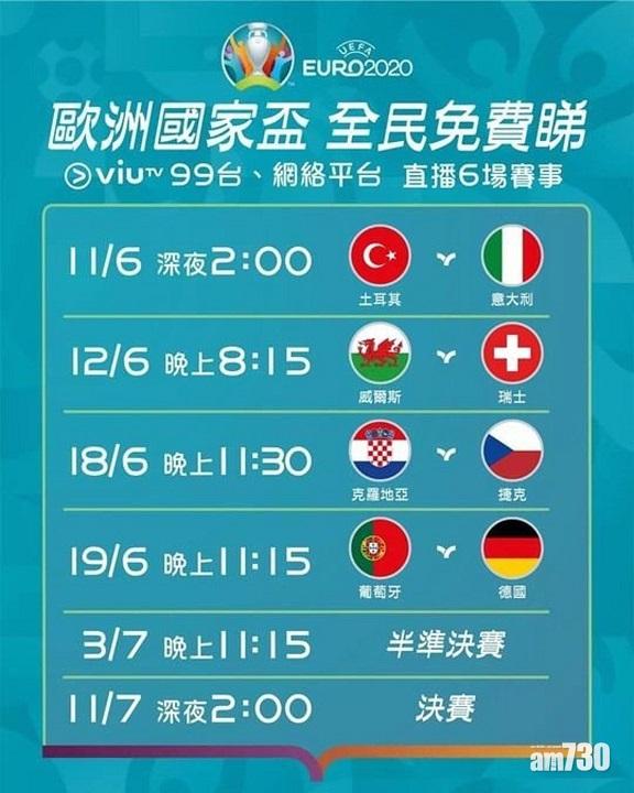 今屆歐國盃將會在NowTV獨家直播51場賽事,設有616、617、618,以及619台直播。此外,球迷亦可以免費在ViuTV觀看6場比賽,包括周六凌晨3時揭幕戰土耳其對意大利、周六晚上9時威爾斯對瑞士、6月18日克羅地亞對捷克、6月19日葡萄牙對法國,以及一場8強賽和一場決賽。