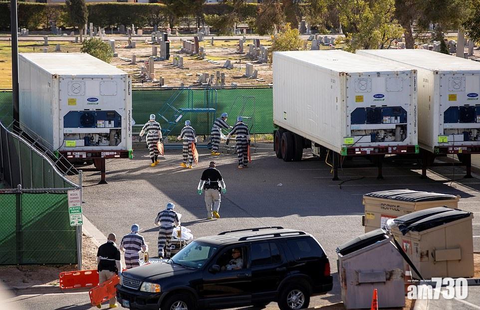 德州一個縣要徵召囚犯(穿黑色橫間衣服),搬運染疫死者遺體。(路透社)