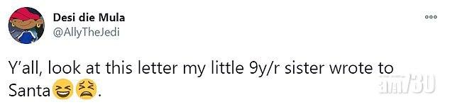 心願清單中有部分是「正常」禮物,包括Airpods耳機、遊戲機及iPhone12等,但當中竟又有「一條蛇」、「一隻熊貓及企鵝(未死的)」。未知是否怕想頭太大會嚇怕聖誕老人、怕真的只得一粒炭,名單中也有相當反高潮的——搓手液。結果小女孩被哥哥出賣,在網上公開此心願清單,網民給得最多的反應是爆笑emoji,有人說「起碼她老實——她不是常常都乖」。也有「不合作、不配合」的網民質疑,信件是大人寫來呃like的。