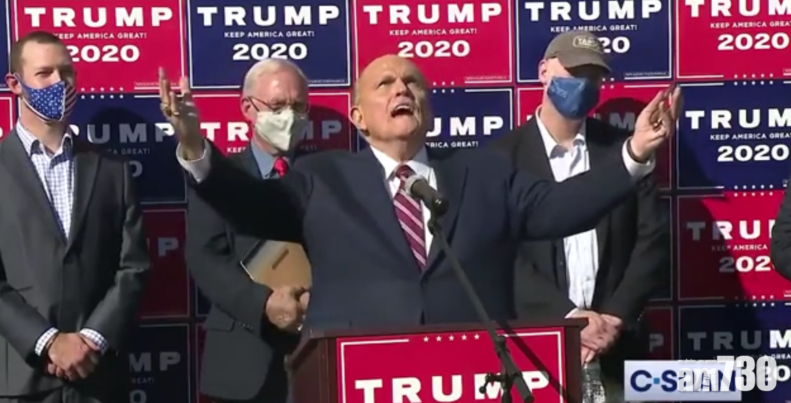 特朗普的私人律師朱利亞尼在賓夕法尼亞州費城舉行記者會時,被問及拜登當選一事,他問結果從哪裡來,記者稱全部傳媒指拜登贏得賓夕法尼亞的20張選舉人票,朱利亞尼諷稱那是傳媒講,非官方結果,並誇張地望向天、舉高雙手說:「嘩,全部傳媒,我們忘記了法律,可以不理法官……傳媒無權決定選舉,那是法院決定」。