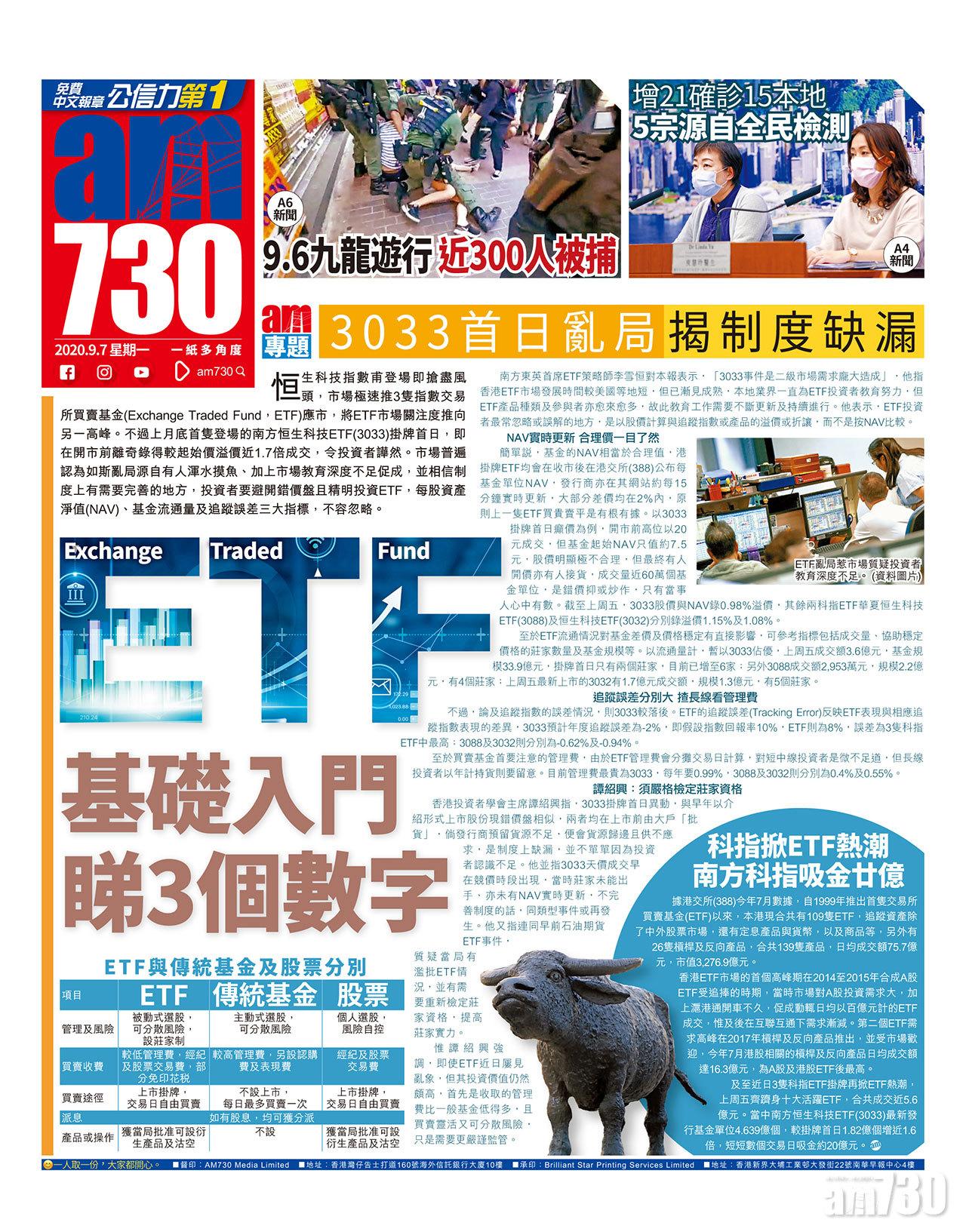 恒生科技指數甫登場即搶盡風頭,市場極速推3隻指數交易所買賣基金(Exchange Traded Fund,ETF)應市,將ETF市場關注度推向另一高峰。不過上月底首隻登場的南方恒生科技ETF(3033)掛牌首日,即在開市前離奇錄得較起始價溢價近1.7倍成交,令投資者譁然。市場普遍認為如斯亂局源自有人渾水摸魚、加上市場教育深度不足促成,並相信制度上有需要完善的地方,投資者要避開錯價盤且精明投資ETF,每股資產淨值(NAV)、基金流通量及追蹤誤差三大指標,不容忽略。
