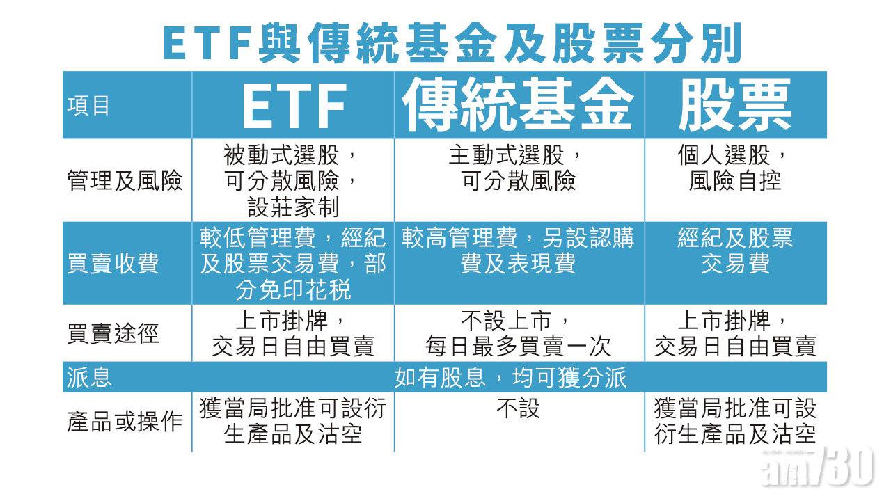 據港交所(388)今年7月數據,自1999年推出首隻交易所買賣基金(ETF)以來,本港現合共有109隻ETF,追蹤資產除了中外股票市場,還有定息產品與貨幣,以及商品等,另外有26隻槓桿及反向產品,合共139隻產品,日均成交額75.7億元,市值3,276.9億元。