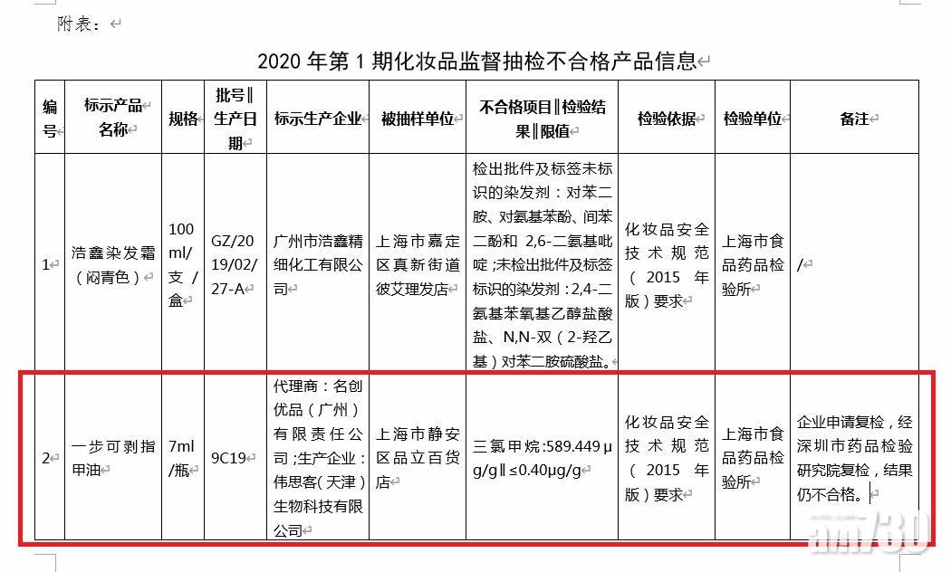 上海市藥品監督管理局上周三公布今年第1期化妝品抽驗結果,963件產品中,有8件不合格,當中「名創優品(Miniso)」銷售、「偉思客(天津)生物科技」生產的「一步可剝指甲油」(7毫升),除了含有內地禁止化妝品添加使用的致癌物「三氯甲烷」(又稱「哥羅芳」),其含量還超標逾1,400倍。上海藥監局披露的資料還顯示,涉事公司曾申請覆核,但深圳市藥品檢驗研究院再次檢驗後,結果仍不合格。