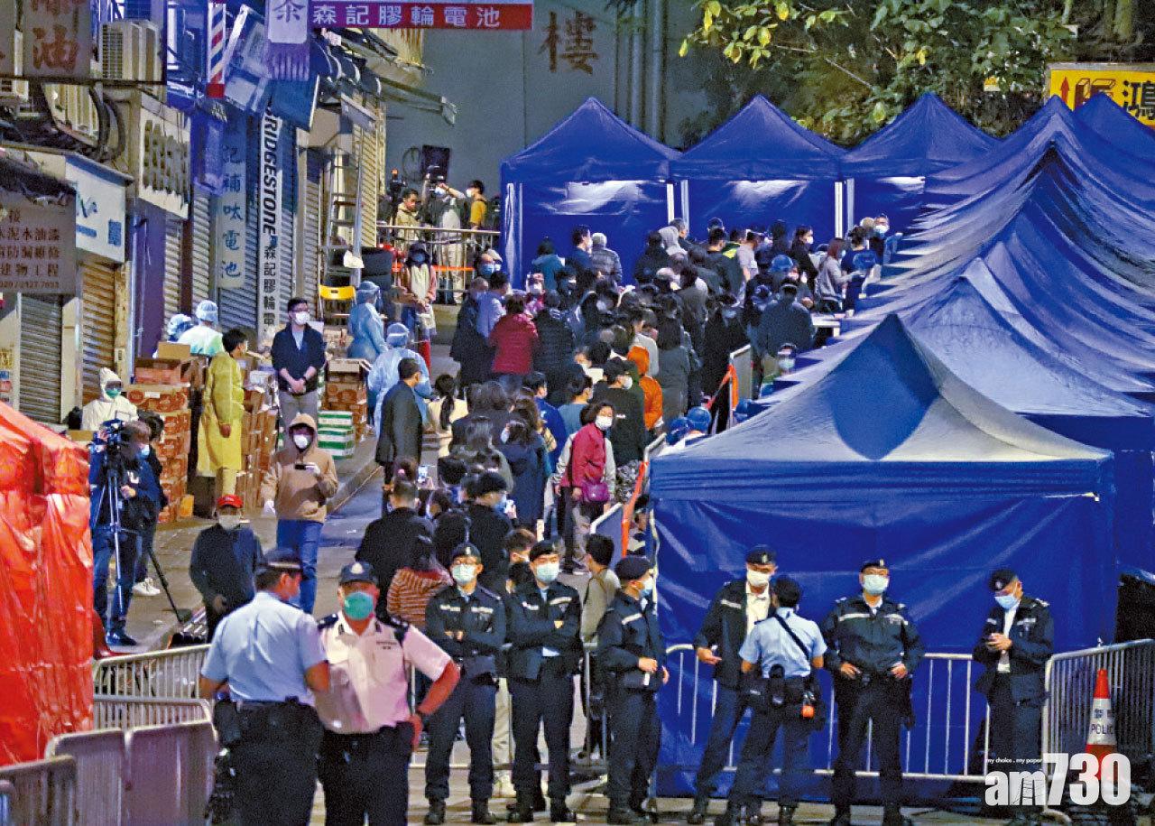 昨晚7時正,在北角錦屏街的警員突然拉起封鎖線圍封東發大廈。被飭令今晨2時或之前完成檢測的居民,昨晚約10時起到街上輪候採樣。當局昨晚以白色膠袋盛載派予居民的食物,但亦有食肆、車房和診所的職員未及離開,料要在店舖過夜。