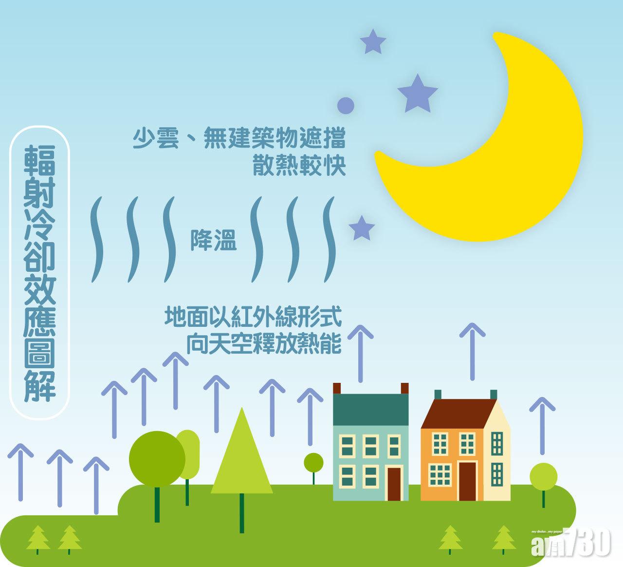 北風颼颼,不少市民昨凌晨起感到異常寒冷,更持續至日間,多區跌至攝氏10度以下;其中,打鼓嶺更曾降至-0.9度,打破2009年-0.8度最低溫紀錄。天文台解釋,昨出現巨大溫差是源於新界內陸地區的「輻射冷卻」(Radiation Cooling)相當顯著。天文台科學主任陳維洵解釋,輻射冷卻是指地面熱能晚上以紅外線形式釋放到天空,新界內陸空曠地方因較少高樓大廈,散熱速度較快,尤其在天朗氣清的日子,輻射冷卻效應會特別明顯,氣溫會顯著較市區低。由於「輻射冷卻」效應強弱,亦取決於雲量及地表的風速,因此在昨日雲少、乾燥及吹微風的天氣情況下,紅外線散熱較快,增加輻射冷卻效應,所以才會出現打鼓嶺只有-0.9度的破紀錄低溫。