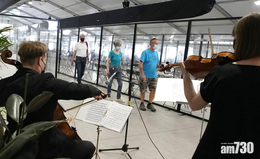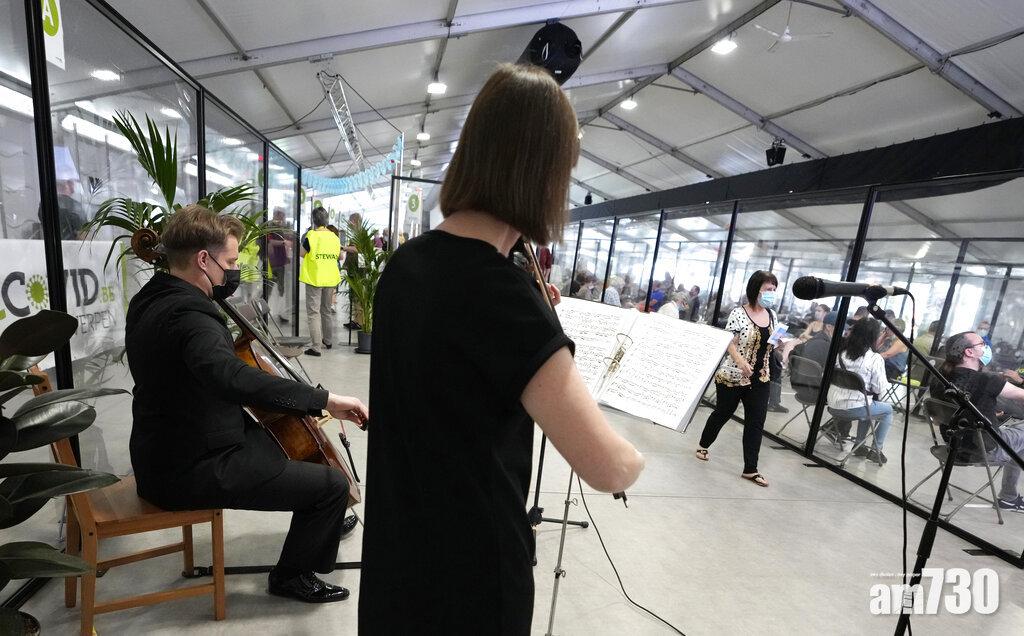 比利時配合歐盟建議推行新冠疫苗接種證明。圖為安特衛普一個接種中心設弦樂表演。(美聯社)