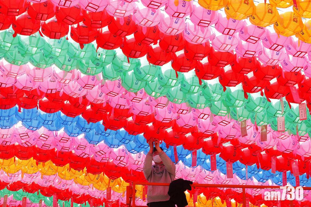 南韓疫情未明顯受控。首爾寺廟一名職員幫善信掛上祈願燈籠。(資料圖片)